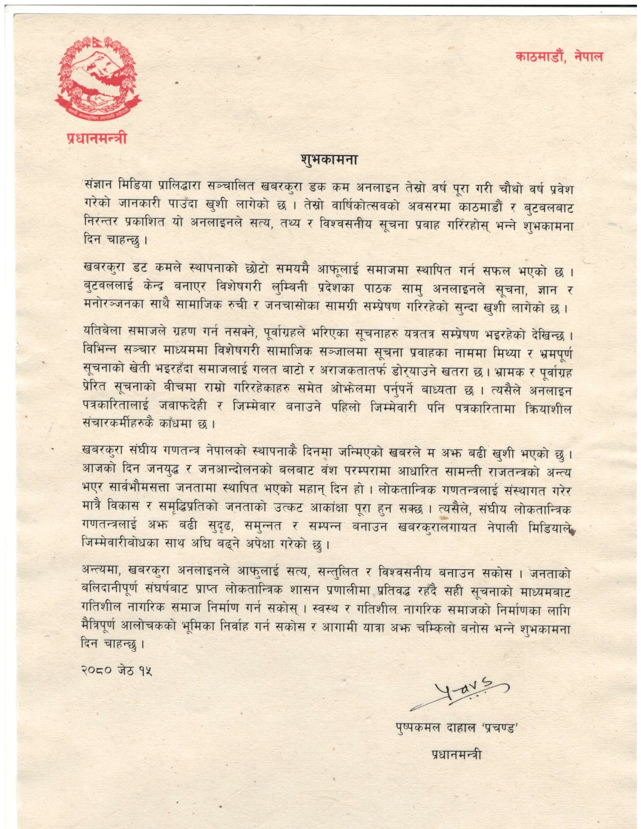 संज्ञान मिडिया प्रालिद्वारा सञ्चालित खबरकुरा डटकम अनलाइन तेस्रो वर्ष पूरा गरी चौथो वर्ष प्रवेश गरेको अवसरमा शुभकामना सन्देश दिँदै प्रधानमन्त्री प्रचण्डले खबरकुराले काठमाडौं र बुटवलबाट निरन्तर प्रकाशित यो अनलाइनले सत्य, तथ्य र विश्वसनीय सूचना प्रवाह गरिरहोस् भन्ने शुभकामना दिएका छन् ।