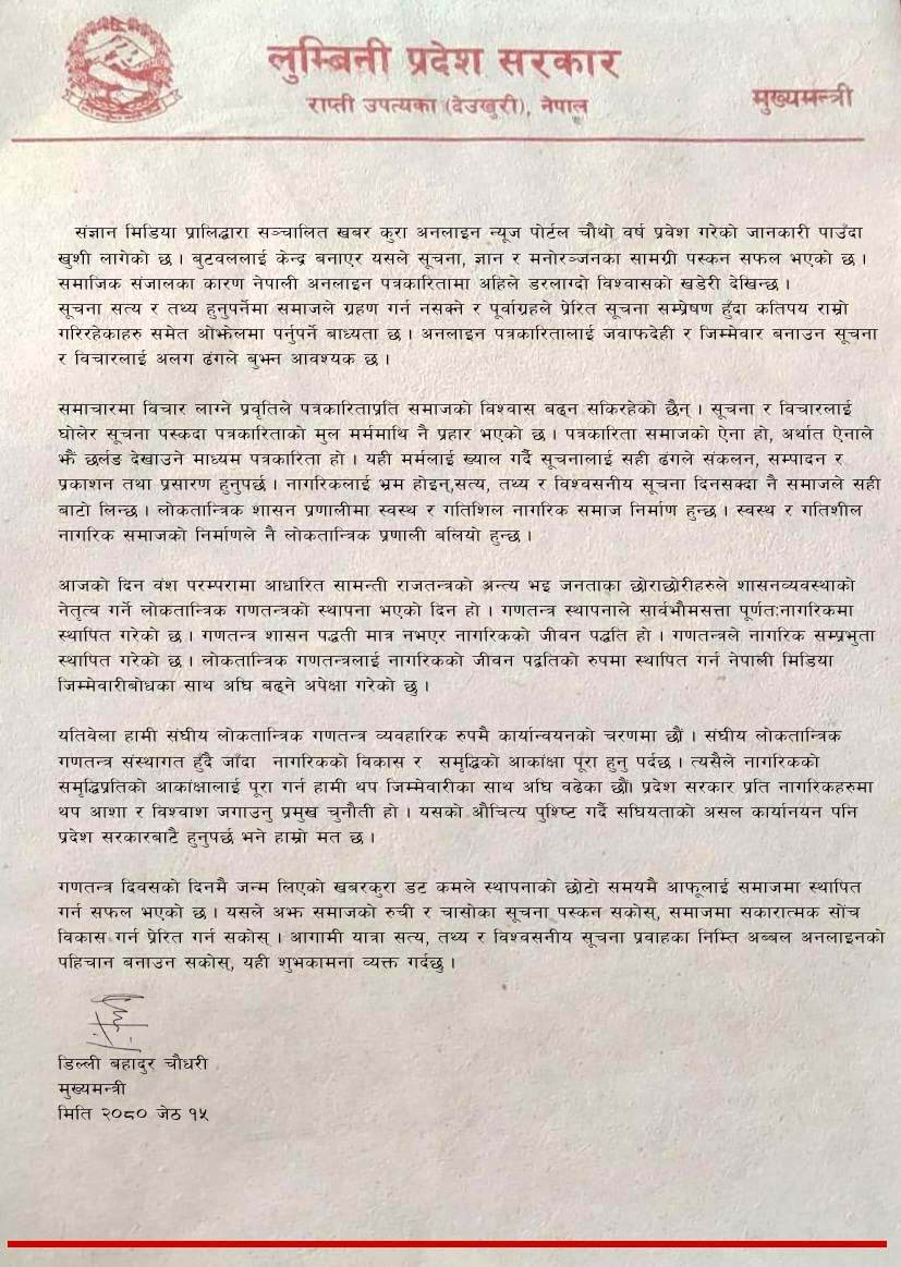 खबरकुरा डट कमको तेस्रो वार्षिकोत्सवको अवसरमा शुभकामना सन्देश दिँदै मुख्यमन्त्री चौधरीले प्रदेश यस्तो बताएका हुन् । चौधरीले बुटवललाई केन्द्र बनाएर खबरकुराले सूचना, ज्ञान र मनोरञ्जनका सामग्री पस्कन सफल भएकोमा शुभकामना दिएका छन् ।