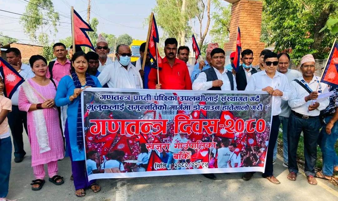 गणतन्त्र प्राप्ति पछिका उपलव्धिलाई संस्थागत गर्दै मुलुकलाई समुन्नतिको मार्गमा डोर्याउन हातेमालो गरौं भन्ने मुल नाराका साथ खजुरा गाँउपालिकाले १६ औ गणतन्त्र दिवस मनाएको हो । आज बिहान सोही अवसरमा बृहद प्रभातफेरि गरिएको थियो ।