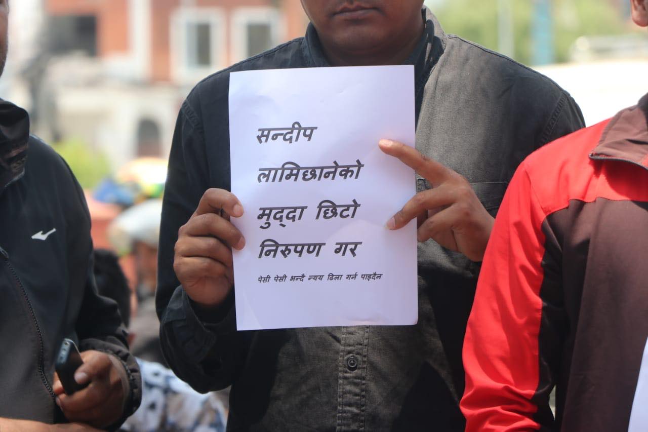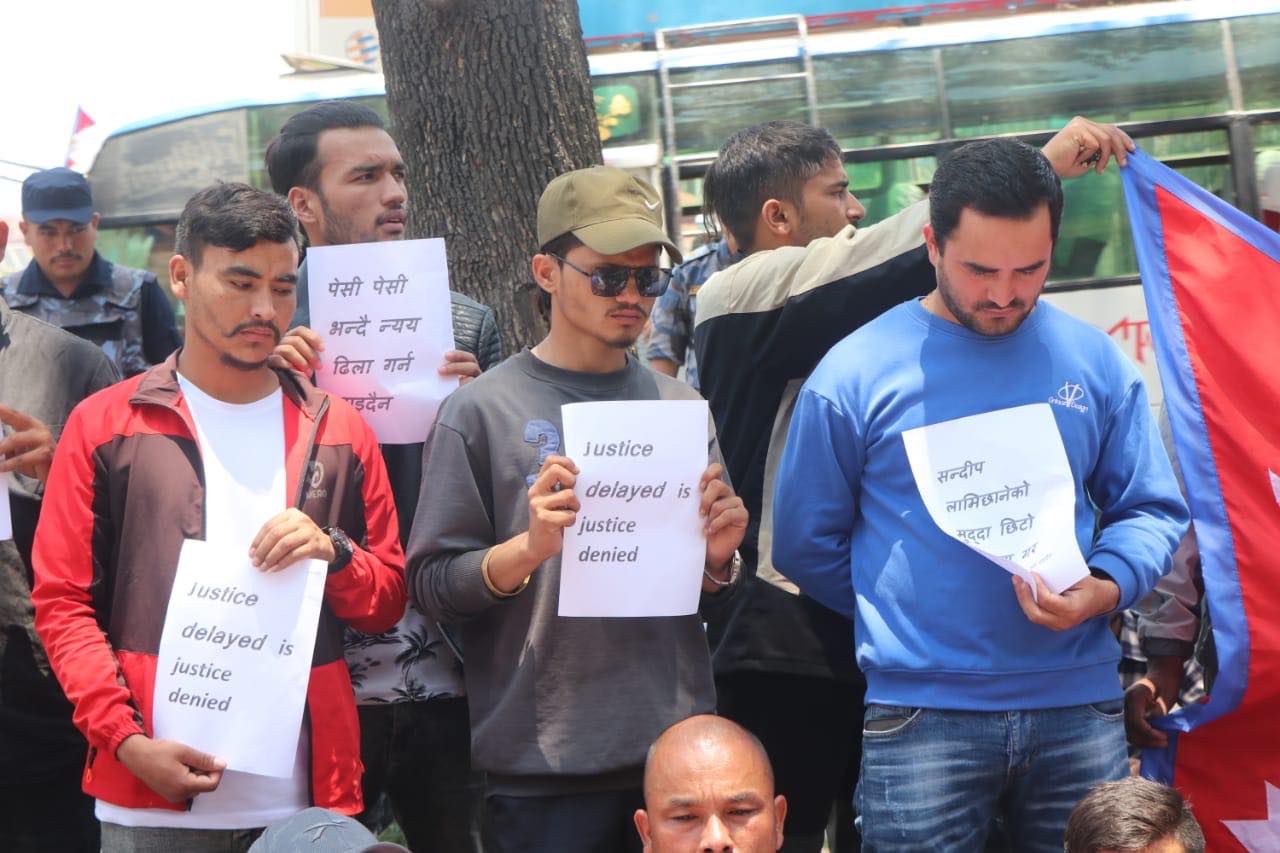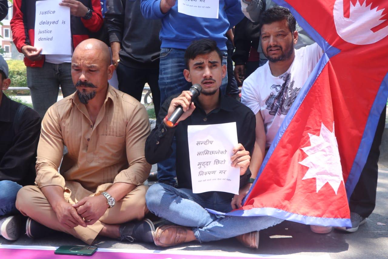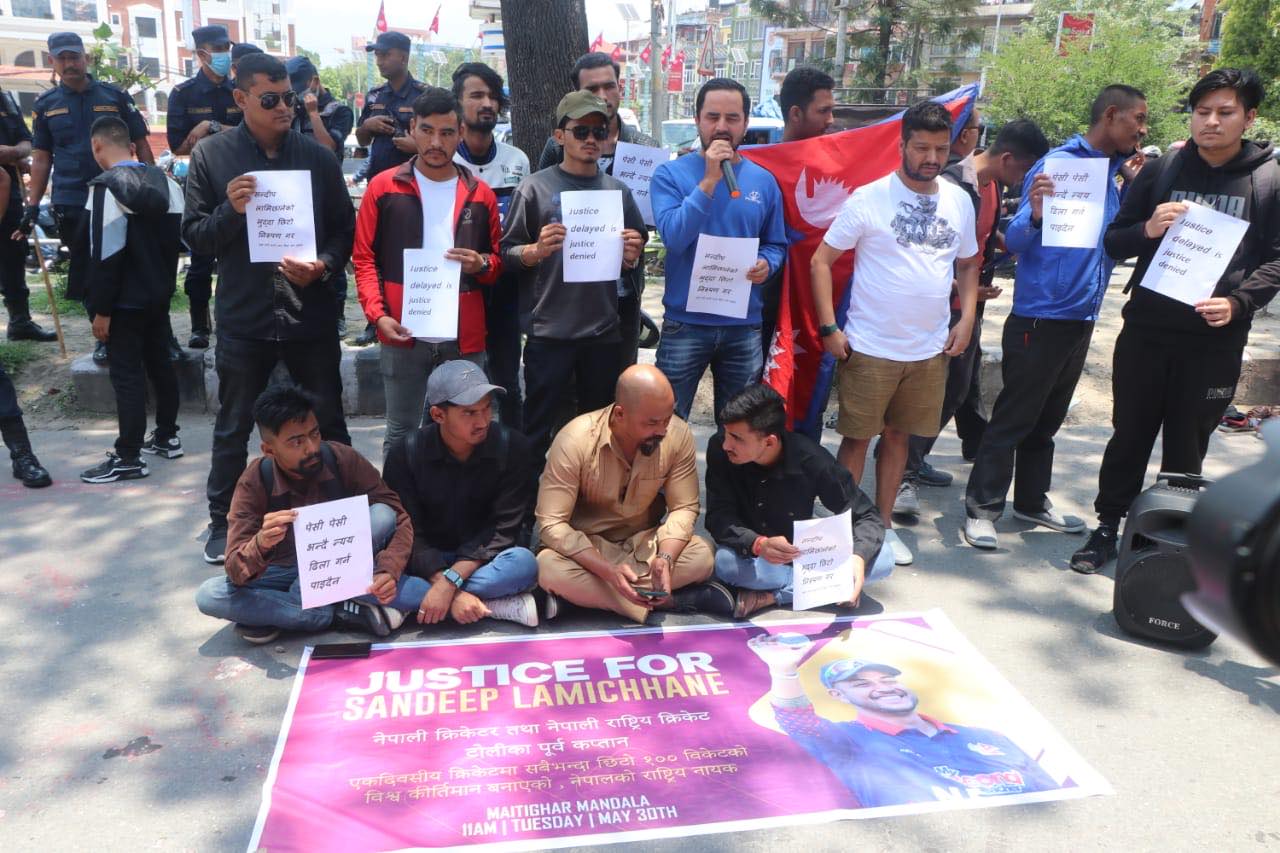 काठमाडौं । क्रिकेटर सन्दीप लामिछाने न्यायका लागि युवाहरुले प्रदर्शन गरेका छन् । काठमाडौंको माइतीघर मण्डलामा मंगलबार भेला भएका युवाहरुले सन्दीपलाई चाँडो न्याय दिन माग गरेका छन् ।