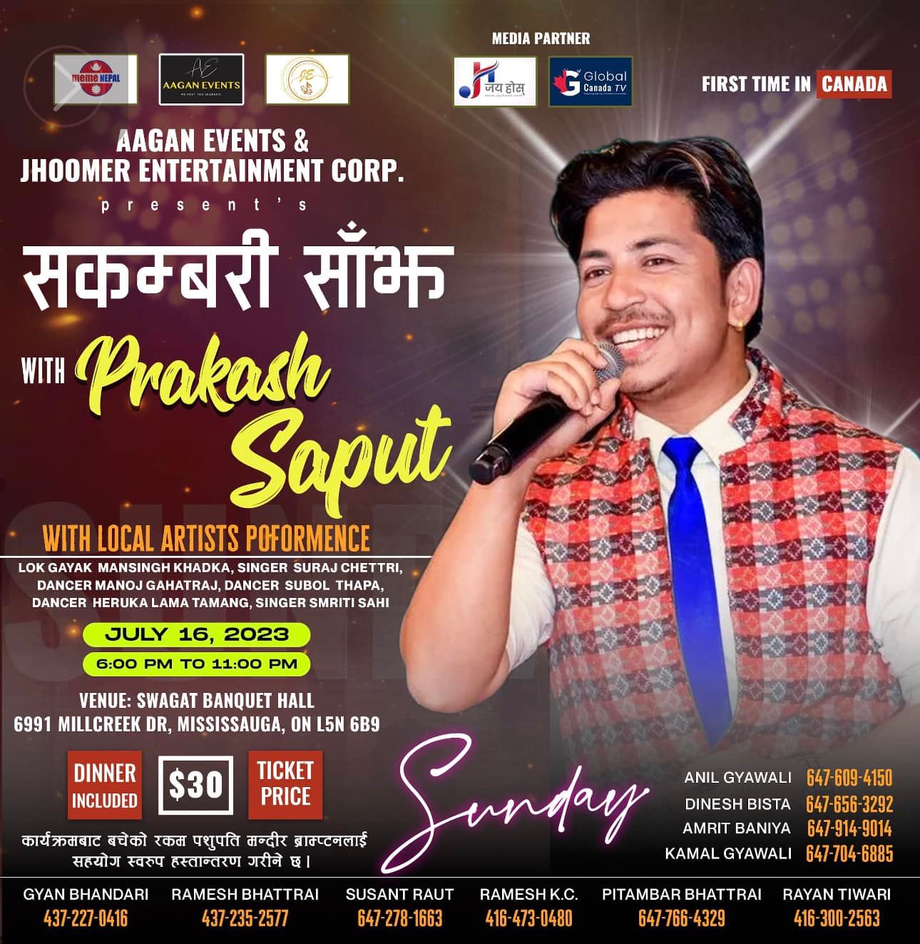 आँगन इभेन्ट्स एण्ड झुमर इन्टरटेनमेन्ट कर्पोरेशनको आयोजनामा गायक प्रकाश पहिलो पटक क्यानाडा प्रस्तुत हुँदैछन् । ‘क्यानाडा आउँदैछु । निकै खुशी छु, यहाँ आफ्नो प्रस्तुती दिनेछु’, गायक प्रकाशले भने,‘अन्य देशमा बारम्बार प्रस्तुती दिएता पनि क्यानाडामा भने पहिलो पटक प्रस्तुत हुँदैछु ।’ उनी आफ्नो प्रस्तुतीलाई लिएर उत्साहित छन् ।