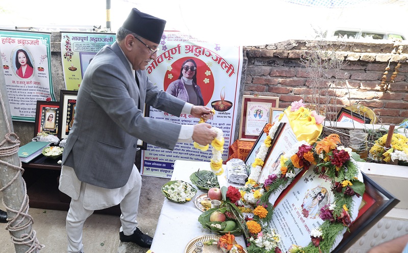 सुर्खेत । प्रधानमन्त्री पुष्पकमल दाहाल ‘प्रचण्ड’ले सवारी दुर्घटनामा निधन भएकी उपप्रधानमन्त्री तथा रक्षामन्त्री पूर्णबहादुर खड्काकी माइली भाइबुहारी डा सञ्जु खाती खड्काप्रति श्रद्धाञ्जली अर्पण गरेका छन् ।