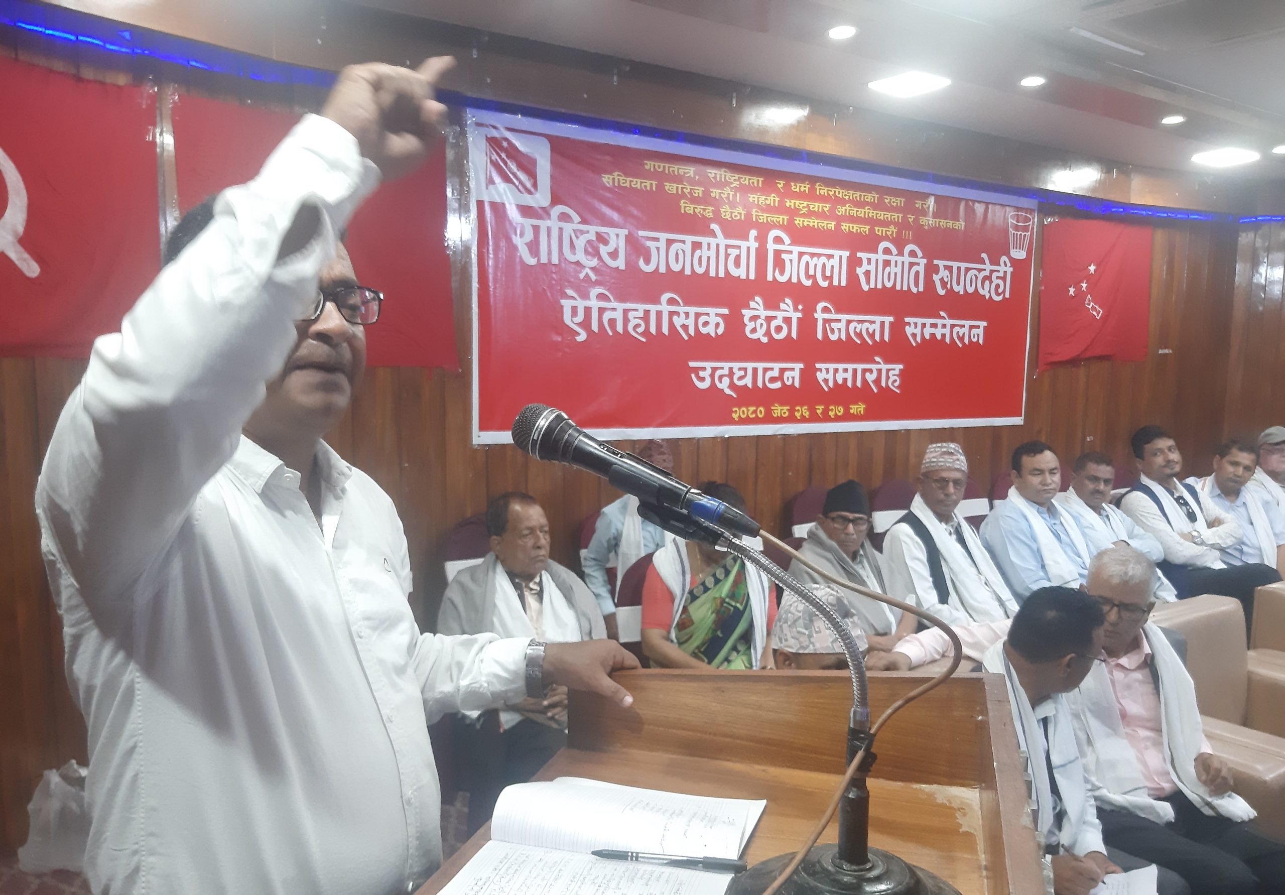 राष्ट्रिय जनमोर्चा रुपन्देही अध्यक्ष वद्रे आलमको अध्यक्षता र सचिव टानबहादुर केसीको सञ्चालनमा भएको कार्यक्रममा राष्ट्रिय जनमोर्चाकी नेतृ इन्द्रिरा ज्ञवाली, जसपा रुपन्देही अध्यक्ष महेन्द्र यादव, लगायतले बोलेका थिए ।