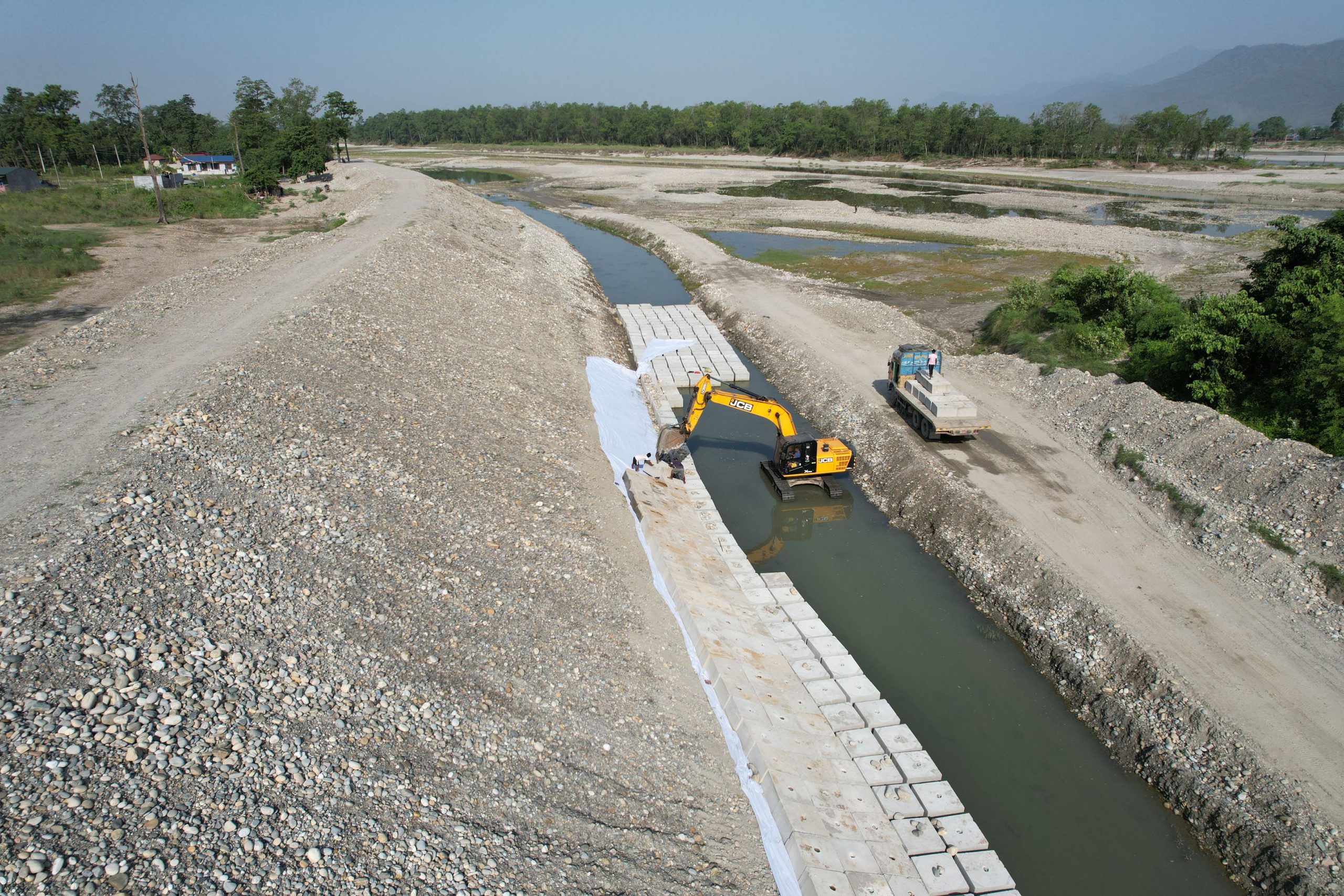 रत्ननगर । चितवन र नवलपुर भएर बग्ने नारायणी नदीमा करिब ५ अर्बको लागतमा निर्माणाधीन तटबन्ध । पहिलो चरणमा बाढीको समयमा कटान गर्न सक्ने स्थानमा अहिले धमाधम तटबन्ध निर्माण कार्य भईरहेको छ । तस्बिर : सुरेन कुँवर/रासस