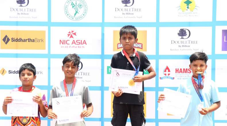 काठमाडौं । प्रथम राइजिङ स्टार खुला टेनिस प्रतियोगितामा बुटवलका निश्चल ज्ञवालीले यु—१० उमेर समुहमा विजेता बन्दै स्वर्ण पदक जितेका छन । उनले फाईनलमा पोखराका आरएस पौडेललाई ६—३, ६—४ को सोझो सेटमा पराजित गर्दै स्वर्ण पदक जितेका हुन् ।
