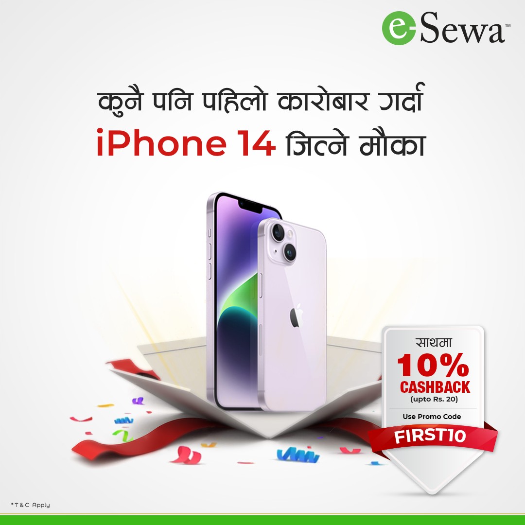 नयाँ तथा एकाउन्ट भएर पनि हालसम्म कारोबार नगरेका ग्राहकलाई लक्षित् गर्दै इसेवाले पहिलो पटक कारोबार गर्दा भाग्यशाली एक जना विजेताले आइफोन १४ र १० प्रतिशत क्यासब्याक जित्न सकिने अफर सार्बजनिक गरेको हो ।