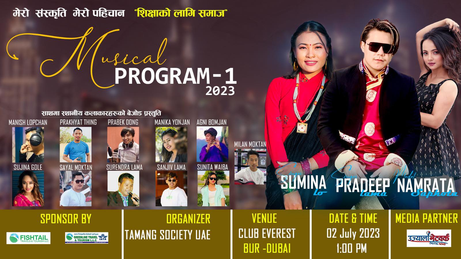 उक्त कार्यक्रमका लागि सांस्कृतिक प्रस्तुति दिन नेपालबाट चर्चित सेलो गायिका सुमिना लो, गायक प्रदिप लामा र मोडल तथा नायिका नम्रता सापकोटा युएई जाँदैछिन भने युएईमा रहेका स्थानीय कलाकारहरुले समेत आफ्नो प्रस्तुति दिने तामाङ समाज युएईका महासचिव नवीन दोङले जानकारी गराए ।