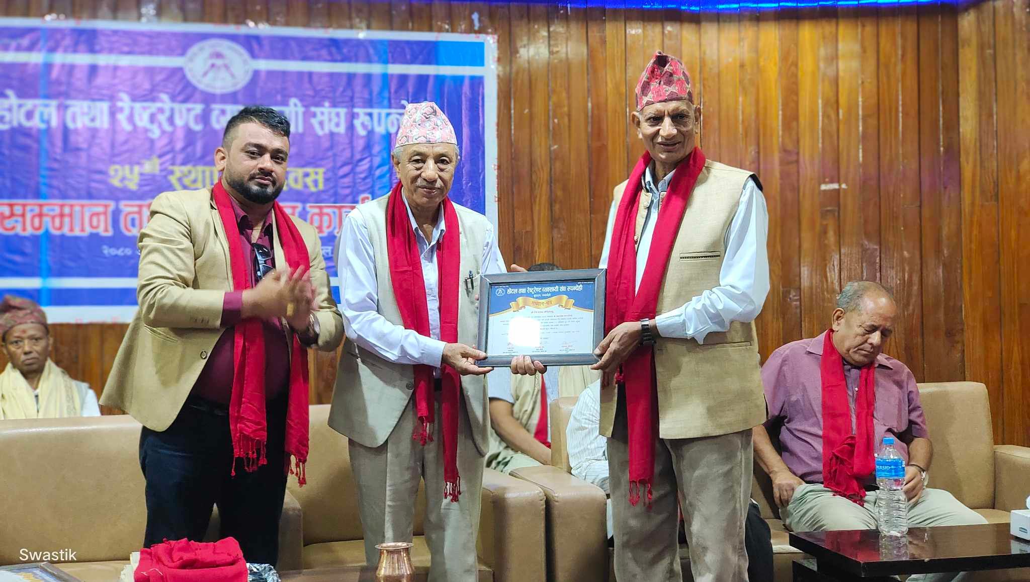 बुटवल । होटल तथा रेष्टुरेन्ट व्यवसायी संघ रुपन्देहीको २५ औ स्थापना दिवसको अवसरमा विविध रचनात्मक कार्यक्रम गर्दै मनाएको छ । कार्यक्रममा संस्थापक देखी छुट दिएका घरधनी सम्मान गरि मनाईएको हो ।