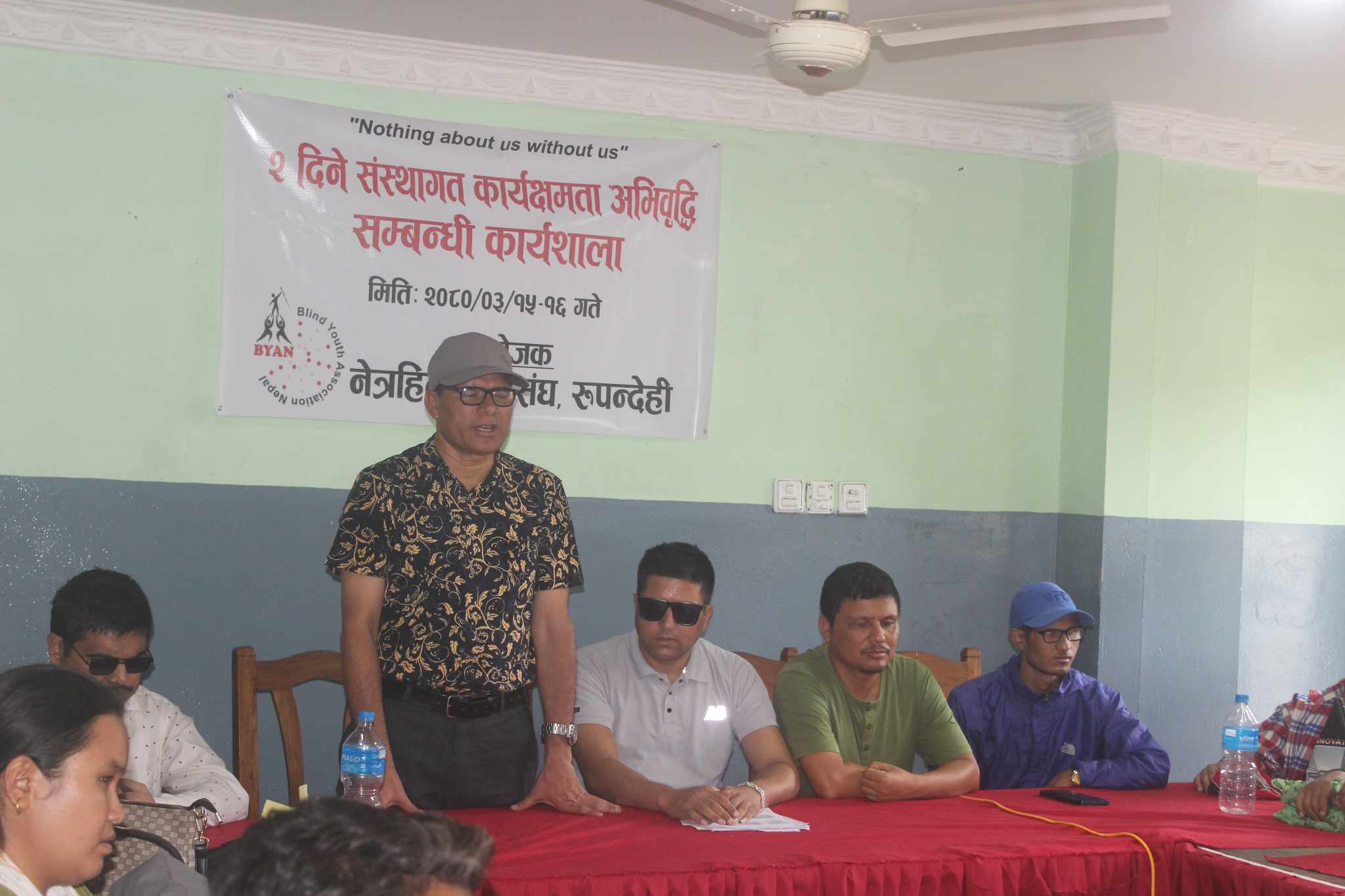 कार्यशालाको समापन कार्यक्रममा बोल्दै नेपाल नेत्रहिन युवा संघ नेपाल रुपन्देहीका अध्यक्ष जीवन पोखरेलले सदस्यहरुको क्षमता अभिवृद्धिका लागि विभिन्न समयमा विभिन्न प्रकृतिको कार्यक्रम गर्दै आएको बताए । उनले संस्थाको हितका लागि लागिपरेका सदस्यहरुको हितका लागि आफुले जहिले पनि सहयोग गर्दै जाने भन्दै विभिन्न निकाय संगको सहकार्यमा तालिम, सेमिनार, तथा गोष्ठी समेत आयोजना गरी दृष्टिविहिनता भएका व्याक्तिहरुको आयआर्जनका लागि समेत योगदान दिने प्रतिवद्धता समेत जनाए ।