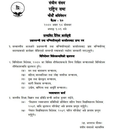 शिक्षा विज्ञान तथा प्रविधि मन्त्री अशोक राईले विधायन व्यवस्थापन समितिको प्रतिवेदनसहित नेपाल विश्वविद्यालय विधेयक २०७९ माथि छलफल गरियोस् भन्ने प्रस्ताव प्रस्तुत गर्ने कार्यसूची रहेको संसद् सचिवालयले जनाएको छ ।