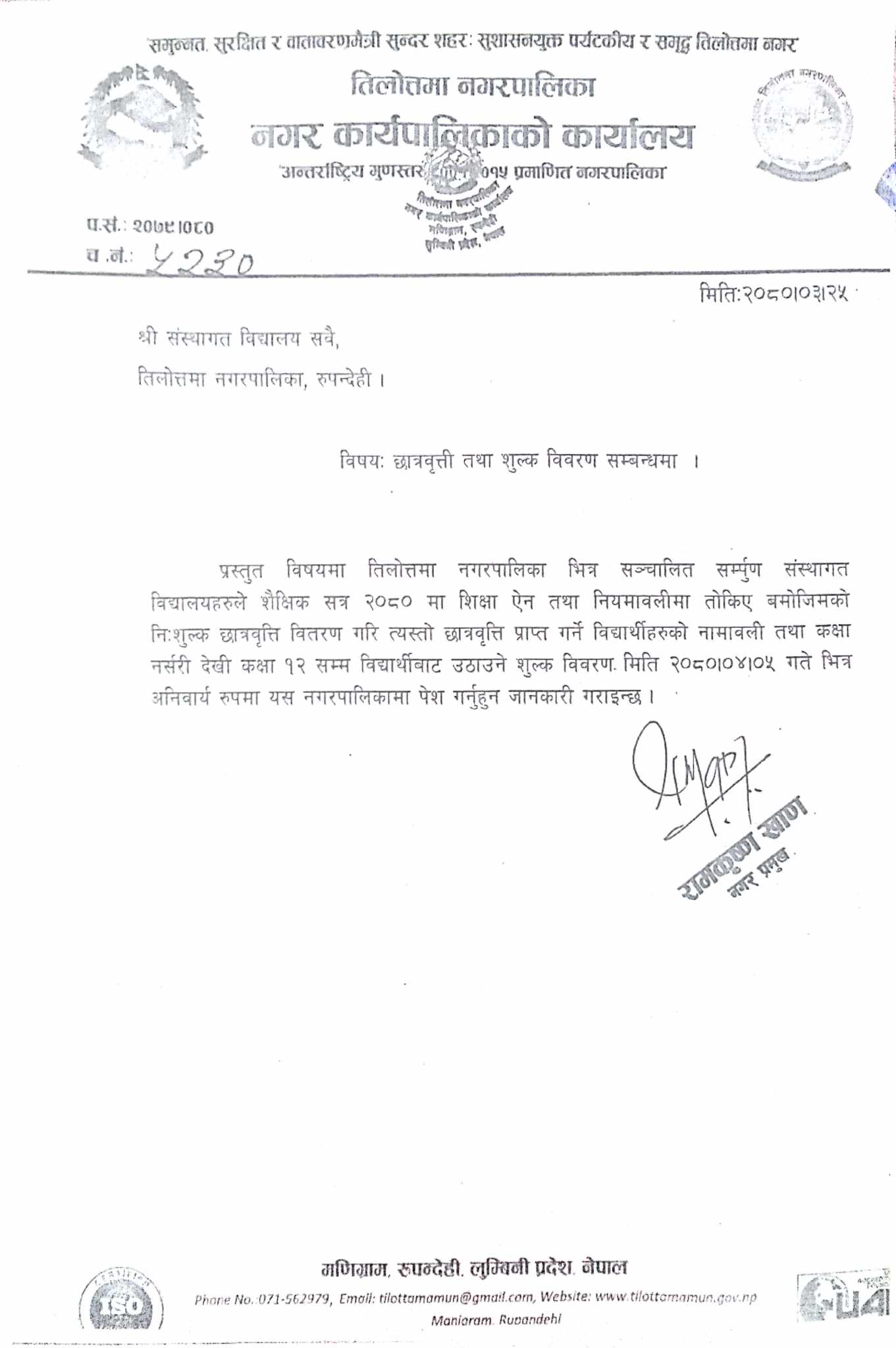 ‘प्रस्तुत विषयमा तिलोत्तमा नगरपालिका भित्र सञ्चालित सम्पुर्ण संस्थागत विद्यालयहरुले शैक्षिक सत्र २०८० मा शिक्षा ऐन तथा नियमावलीमा तोकिए बमोजिमको निःशुल्क छात्रवृत्ति विवरण गरि त्यस्तो छात्रवृत्ति प्राप्त गर्ने विद्यार्थीहरुको नामावली तथा कक्षा नर्सरी देखी कक्षा १२ सम्म विद्यार्थीबाट उठाउने शुल्क विवरण मिति २०५०/०४/०५ गते भित्र अनिवार्य रुपमा यस नगरपालिकामा पेश गर्नुहुन जानकारी गराइन्छ ।’- पत्रमा भनिएको छ ।