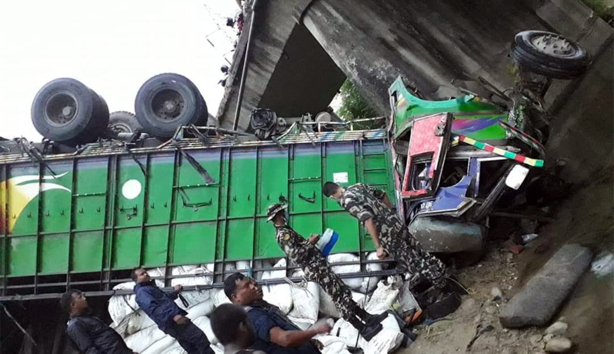 ट्रक पुलको रेलिङ भाँच्दै खोलामा खसेको छ । नेपाल प्रहरी र नेपाली सेनाको टोली उद्धारमा खटिएका छन् ।