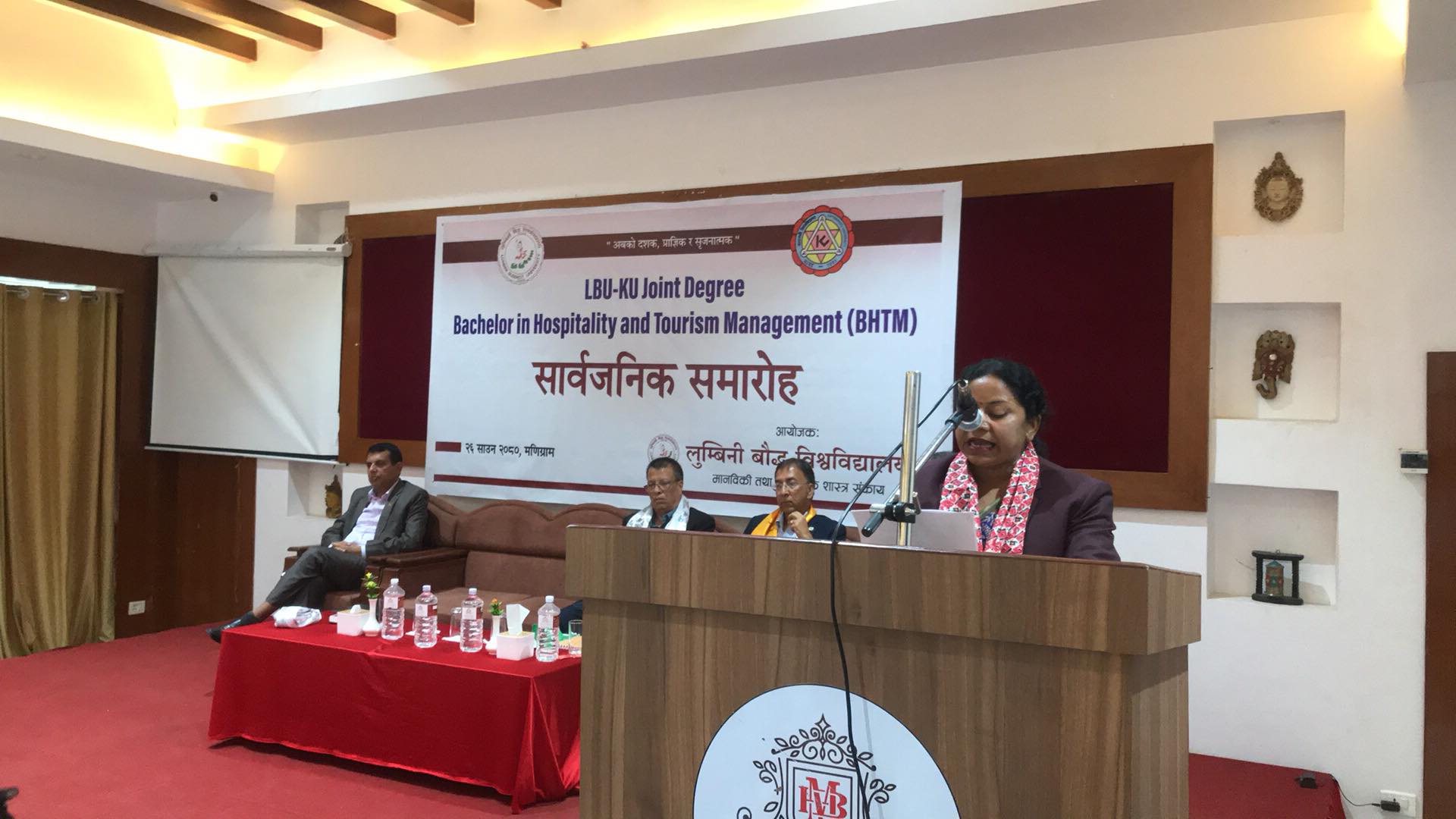 कार्यक्रममा बोल्दै लुम्बिनी बौद्ध विश्वविद्यालयका निमित्त उपकुलपति एवं रजिष्टार डा. तिलकराम आचार्यलेकाठमाडौं विश्वविद्यालयसंगको सहकार्यमा पर्यटन क्षेत्रका लागि आवश्यक सीपयुक्त जनशक्ति उत्पादनका लागि यो कार्यक्रम शुरु गरिएको बताए । गत असार २१ गते सहकार्य सम्झौता भई एक महिनाभित्रमै शैक्षिक कार्यक्रम सार्वजनिक गरिएको भन्दै यस कार्यक्रमलाई सफल बनाउने दायित्व सबैको रहेकोमा उनले जोड दिए ।