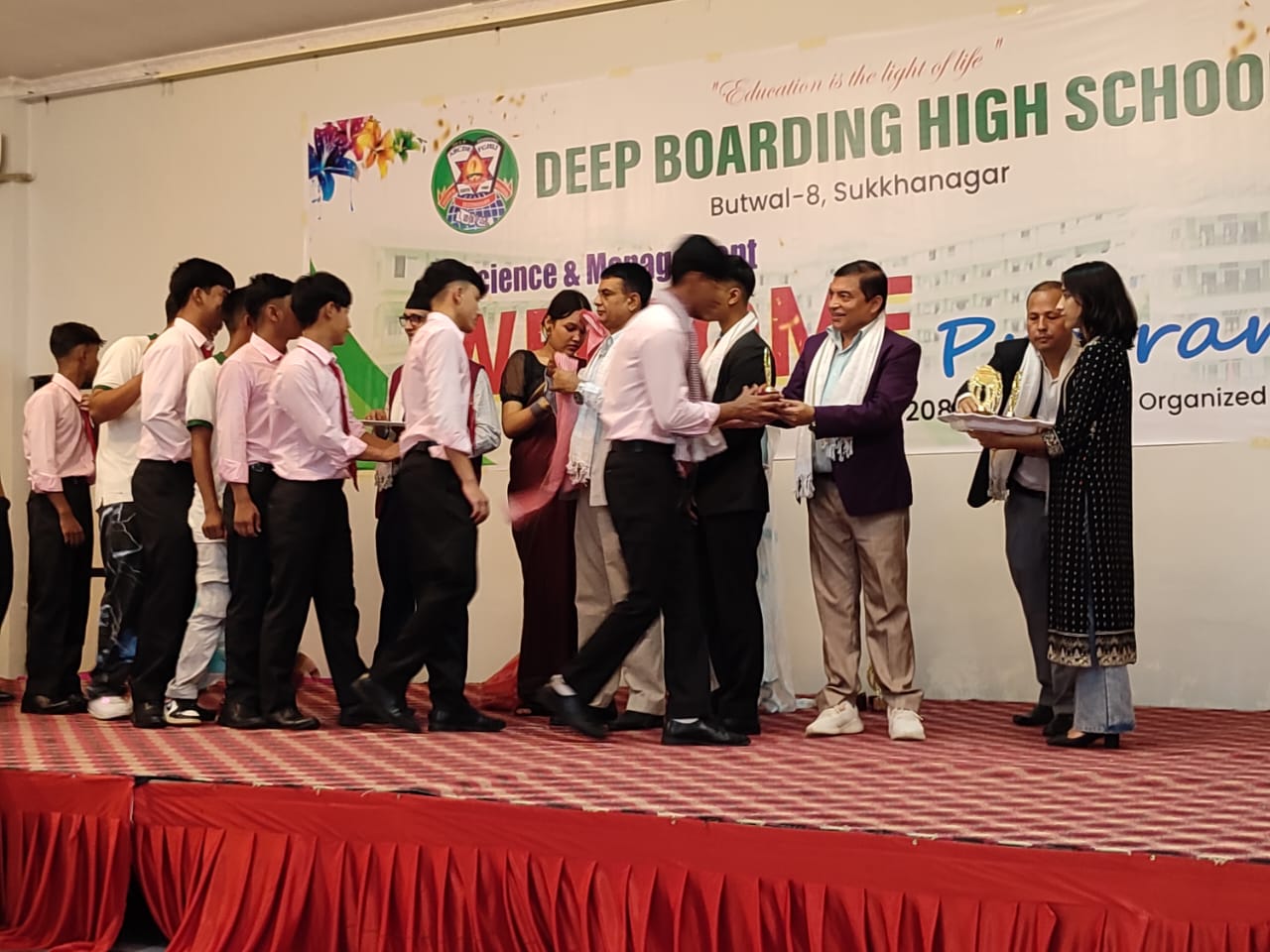 बुटवल । बुटवल-८, सुख्खानगरमा अवस्थित दीप बोर्डिङ हाई स्कुलमा कक्षा ११ मा भर्ना भएका विद्यार्थीहरूलाई एक विशेष कार्यक्रमबिच स्वागत गरिएको छ । विद्यालयको कक्षा १२ का विद्यार्थीहरूको आयोजनामा सिद्धार्थ कटेजमा गरिएको स्वागत कार्यक्रममा नव आगन्तुक विद्यार्थीहरूलाई टीका, खादा र मायाको चिनोसहित स्वागत गरिएको हो ।