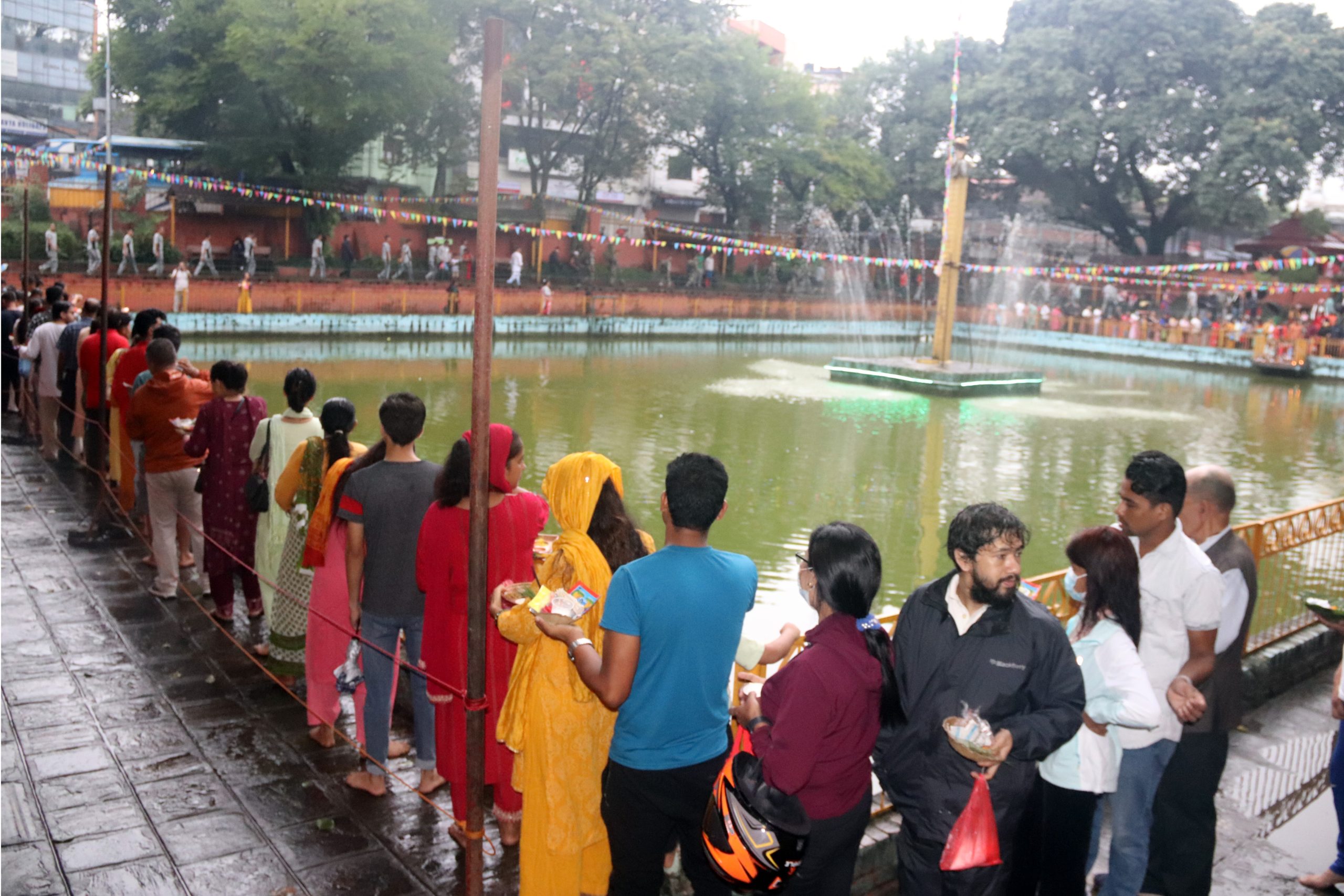 काठमाडौं । काठमाडौंको नक्सालस्थित नागपोखरी परिसरमा सोमबार नाग पूजा गर्न लामबद्ध भएका भक्तजन । तस्बिर : हरिराम भेटुवाल/रासस