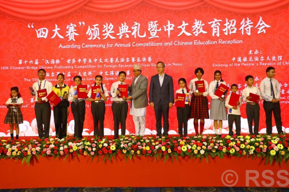 चिनियाँ शिक्षा स्वागत समारोह आयोजना गरी माध्यमिक तहका विद्यालयका विद्यार्थीका लागि १६औँ चाइनिज–ब्रिज चिनियाँ प्रवीणता प्रतियोगितामा उत्कृष्ट विद्यार्थीलाई अवार्ड वितरण गरिएको हो ।