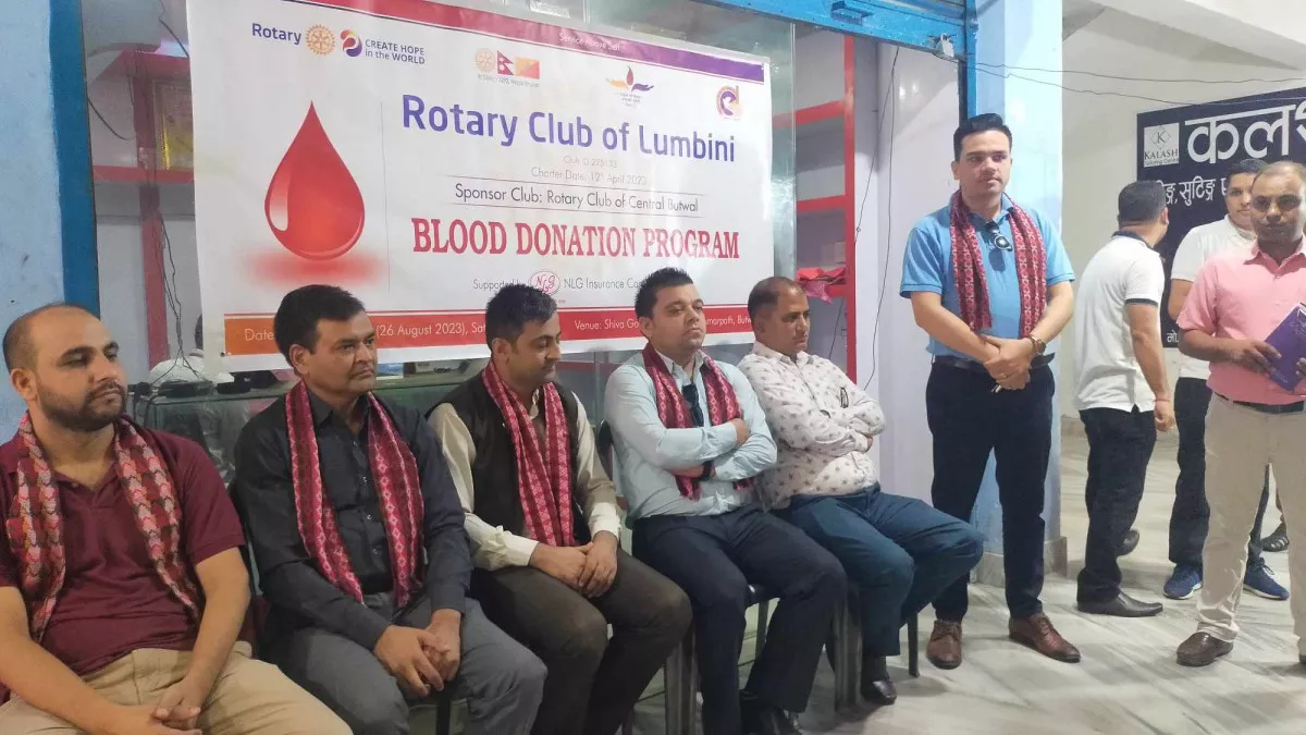 बुटवल । रोटरी क्लब अफ लुम्बिनीले बुटवलमा रक्तदान कार्यक्रम सम्पन्न गरेको छ । एनएलजी इन्सुरेन्स कम्पनी लिमिटेडको आर्थिक सहयोगमा बुटवल अमरपथमा रक्तदान कार्यक्रम भएको हो ।