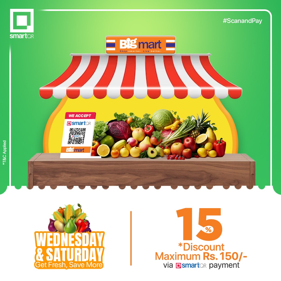 काठमाडौ। स्मार्ट क्यूआरले बिगमार्टसँग सहकार्य गरेको छ । जसअन्तर्गत बिगमार्टमा फलफूल तथा तरकारी खरिद गर्दा स्मार्ट क्यूआरमार्फत भुक्तानीमा पुनः छुट दिने भएको छ । उक्त छुट अफर अन्तर्गत ग्राहकहरुले तरकारी तथा फलफुल खरिदमा स्मार्ट क्युआर मार्फत भुक्तानी गर्दा १५ प्रतिशत सम्म छुट प्राप्त गर्न सक्ने छन् ।