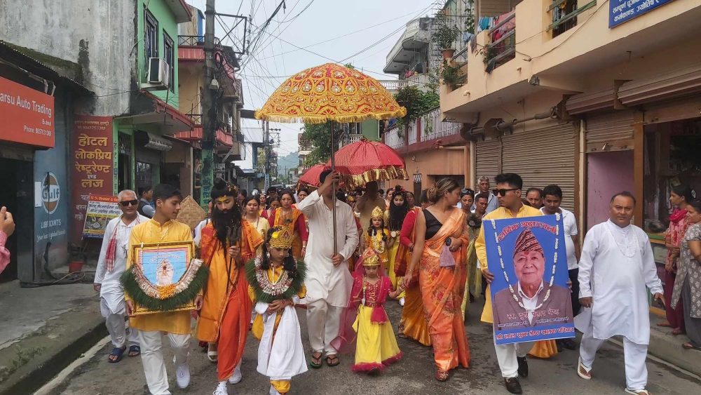 जात्रामा नेवाः समुदायका महिलाहरुले मृतकहरुको स्मरणमा करुणा रसको गीत गायन तथा भजन प्रस्तुत गरेका थिए । जात्रामा प्रतिकात्मक बिबिध पहिरनमा सृङ्गारिएका बालबालिकाले सापारु पदयात्रा गरेका थिए ।