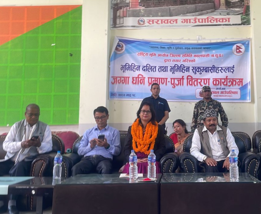 भूमि व्यवस्था, सहकारी तथा गरिबी निवारण मन्त्री रन्जिता श्रेष्ठ चौधरीले सरावल गाउँपालिका वडा नं ३ का २५ भूमिहीन सुकुम्वासी परिवारलाई जग्गाधनी लालपुर्जा प्रदान गरिन् । लामो समयको प्रतीक्षा पछि नवलपरासीको ९पश्चिम० सराबल गाउँपालिकाका २५ परिवारले पुर्जा पाएका हुन ।