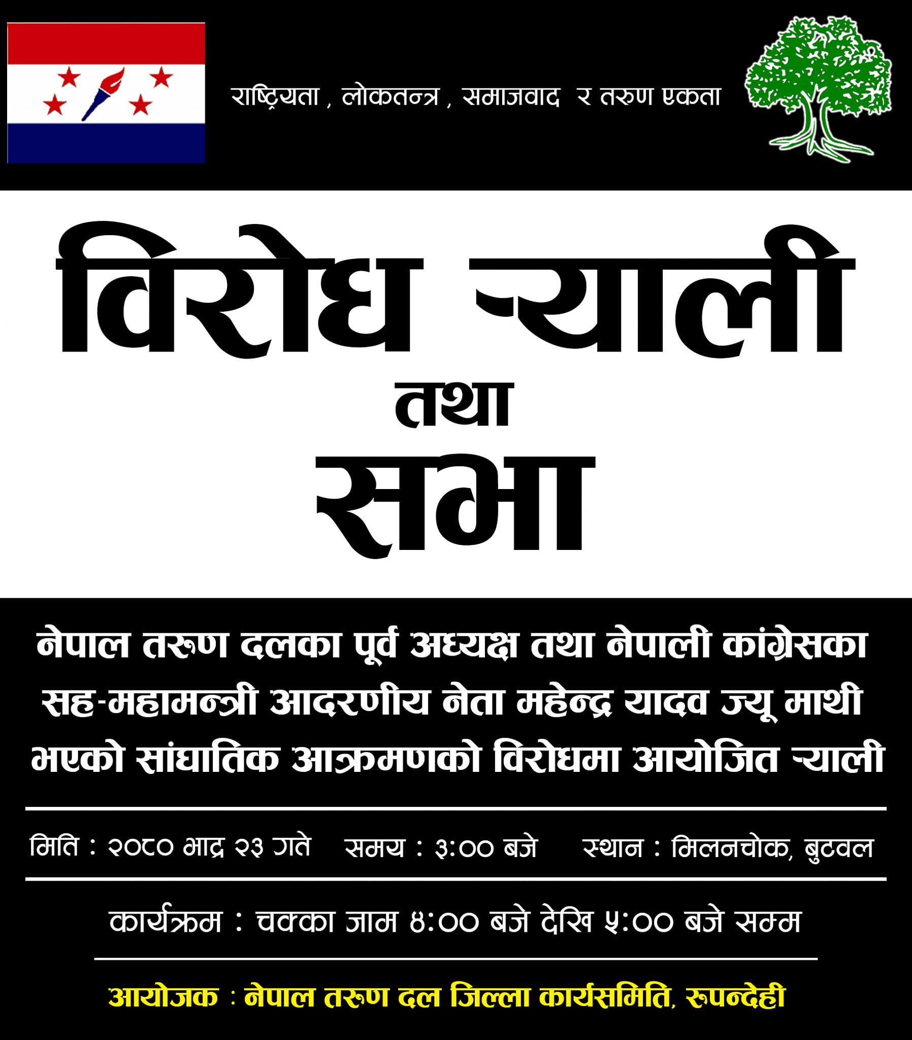 यसै बीच शनिबार विरोध प्रदर्शनसहित एक घण्टा चक्काजाम गरिने नेपाल तरूण दल रूपन्देहीका जिल्ला सदस्य प्रशान्त कोईरालाले जानाकारी दिए । बुधबार दिउँसो रिपोर्टर्स क्लब काठमाडौंमा आयोजित कार्यक्रममा भाग लिएर बाहिरिने क्रममा यादवमाथि आक्रमण भएको थियो ।