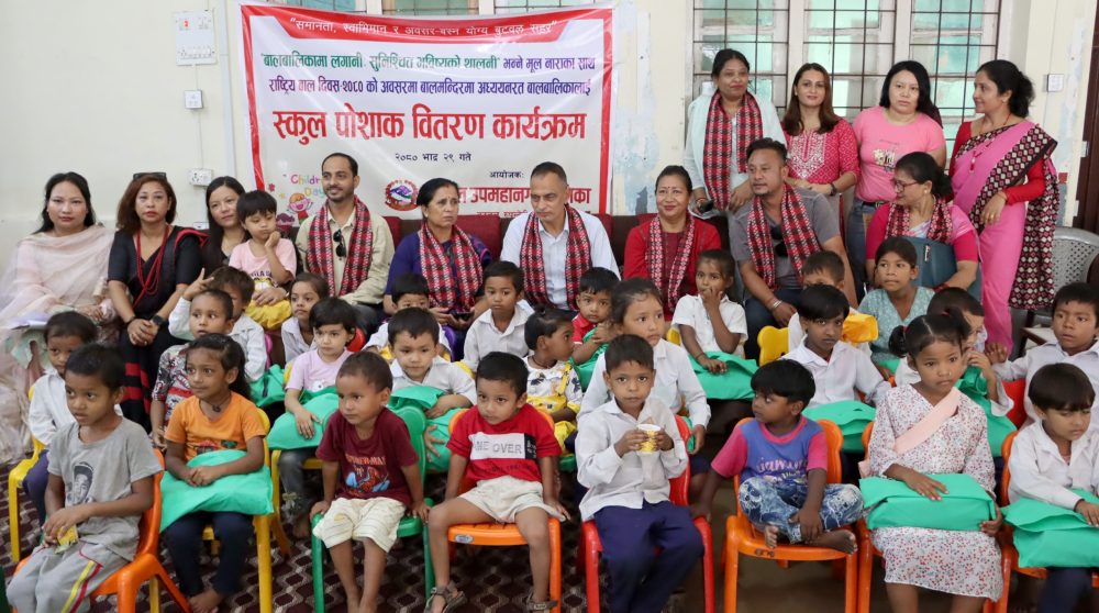पोशाक हस्तान्तरण गर्दै नगर प्रमुख पाण्डेयले घरबाट बालबालिकालाई उचित शिक्षा र उपयुक्त वातावरण प्रदान गर्नुपर्ने बताए।