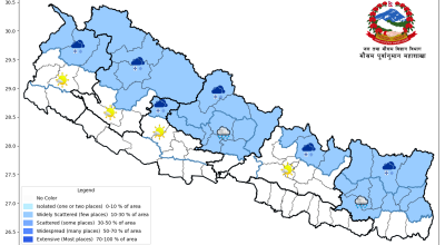 राती देशका पहाडी भू-भागमा आंशिक देखि सामान्य बदली रही बाँकी भू-भागमा आंशिक बदली देखि मौसम सामान्यतया सफा रहनेछ । कोशी, बागमती र गण्डकी प्रदेशका पहाडी भू-भागका केही स्थानहरुमा र देशका बाँकी भू-भागको एक दुई स्थानमा मेघ गर्जन र चट्याङ्गसहित हल्का देखि मध्यम वर्षाको सम्भावना रहेको छ ।