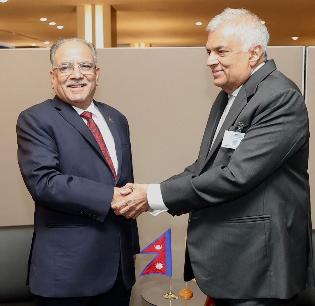 न्यूयोर्क । संयुक्त राष्ट्रसङ्घको ७८ औँ महासभामा भाग लिनका लागि न्यूयोर्क आएका प्रधानमन्त्री पुष्पकमल दाहाल ‘प्रचण्ड’सँग श्रीलङ्काका राष्ट्रपति रनिल विक्रमसिङ्घेबीच मङ्गलबार न्यूयोर्कमा भेट भएको छ ।