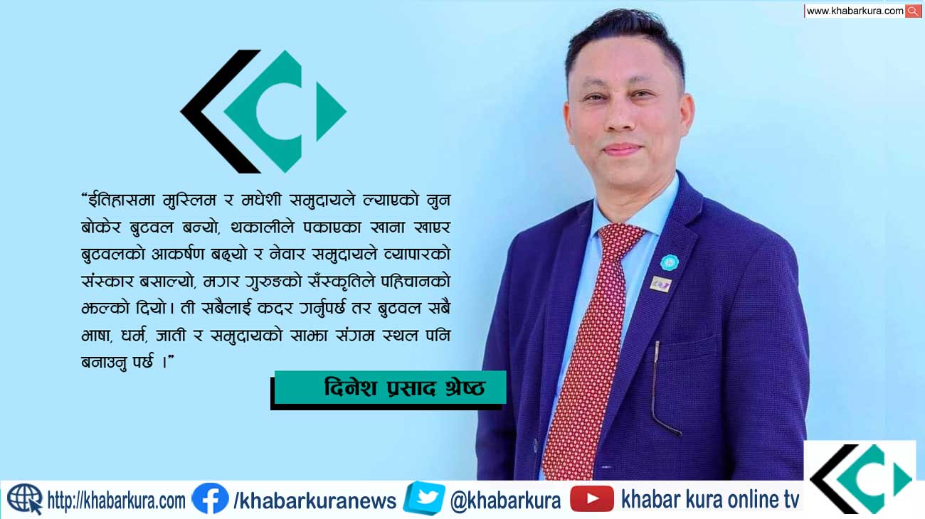 ‘ईतिहासमा मुस्लिम र मधेशी समुदायले ल्याएको नुन बोकेर बुटवल बन्यो, थकालीले पकाएका खाना खाएर बुटवलको आकर्षण बढ्यो र नेवार समुदायले व्यापारको संस्कार बसाल्यो, मगर गुरुङको सँस्कृतिले पहिचानको झल्को दियो ।’ उनी भन्छन्, ‘ती सबैलाई कदर गर्नुपर्छ तर बुटवल सबै भाषा, धर्म, जाती र समुदायको साझा संगम स्थल पनि बनाउनु पर्छ ।’