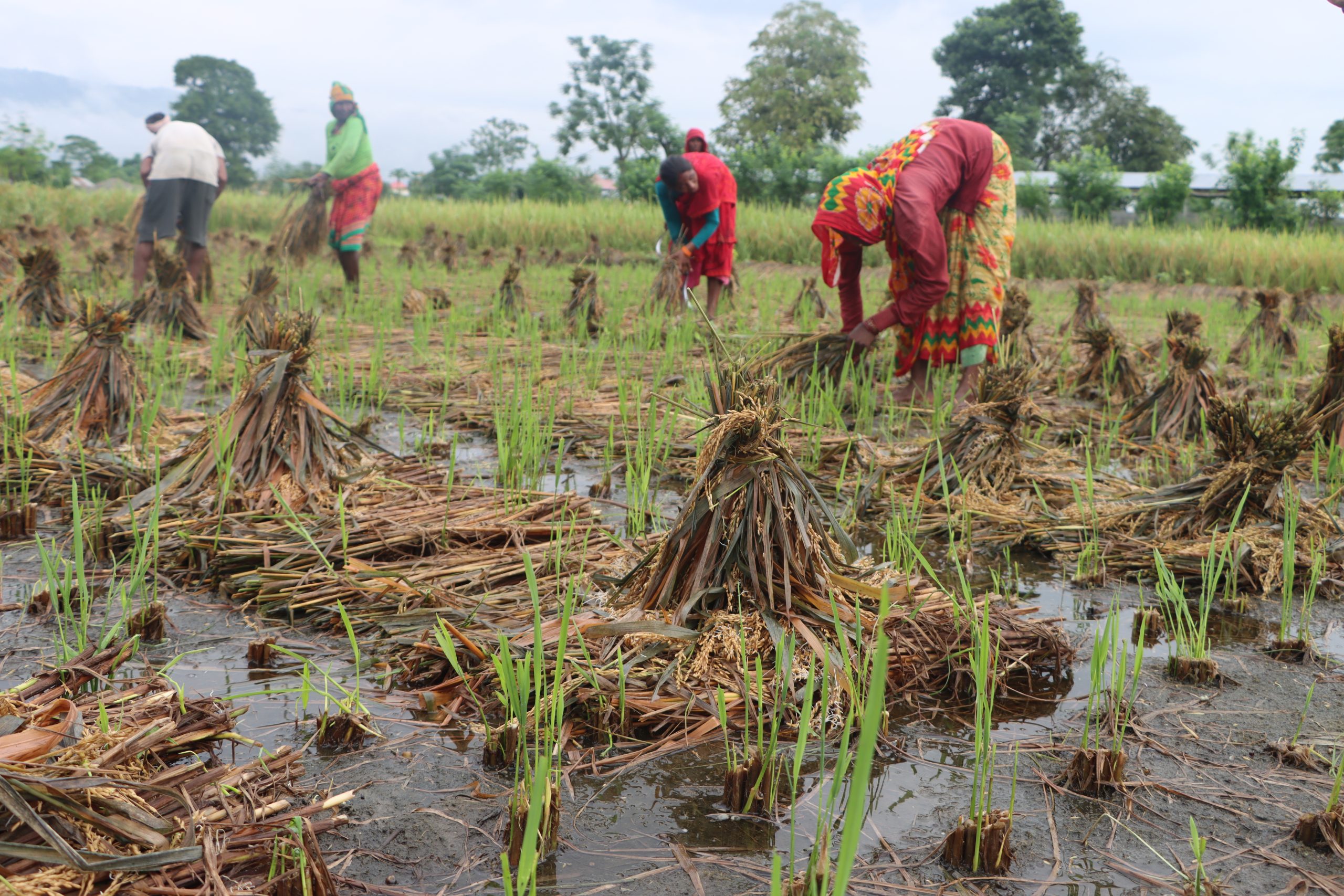 निरन्तरको वर्षाले खेतमा भित्र्याउन काटेर सुकाएको धान डुबाएको भरतपुर महानगरपालिका-१६ स्थित शरणपुरका सुनिल दवाडीले बताए । ‘मैले दुई बिघामा धान लगाएको हो । त्यसमध्ये एक बिघामा लगाएको धान रौतहटबाट खेताला ल्याएर कटाएको थिएँ’, खेतमा पानीले निथ्रुक्क भिजेको धान उठाउँदै गर्दा भेटिएका उनले भने, ‘धान रोप्न गरेको लगानी पनि खेर गयो ।’ खेत रोप्न २५ हजार रुपैयाँ लागेको उनले बताए । लगातार परेको पानीमा डुबेर धान उम्रिएको छ ।