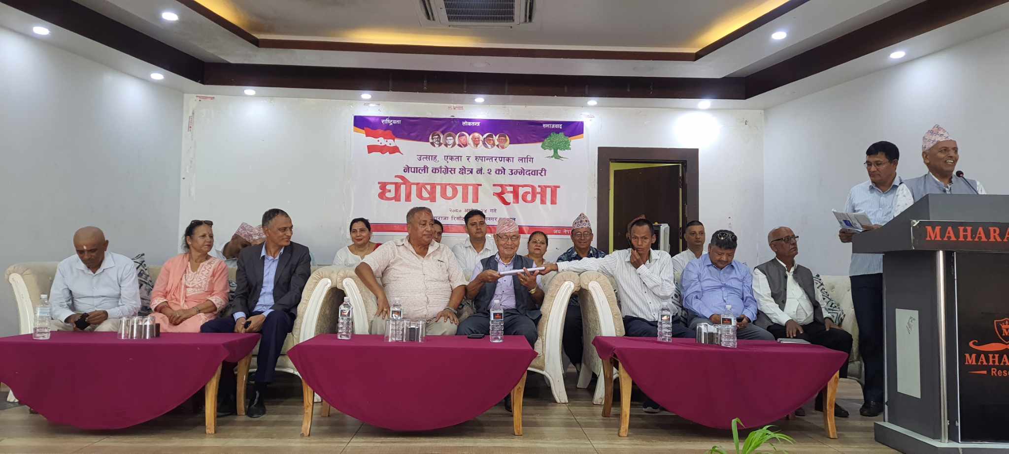 बुटवल । नेपाली कांग्रेस रुपन्देही क्षेत्र नम्बर-२ को सभापतिका लागि बुधबार संस्थापन इतर समूहले उम्मेदवारी घोषणा गरेको छ । बुटवलमा शेखर कोइराला समूहले बुटवल उपमहानगरपालिकाका नगरप्रमुख खेलराज पाण्डेयको उपस्थितिमा फर्सुराम ढकाललाई सभापतिको उम्मेदवार बनाउने घोषणा गरेको हो ।