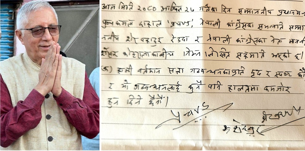 काठमाडौं । आफ्नै पार्टी सभापतिप्रति बगावत गर्दै कोशीमा एमालेसँग मिलेर आफ्ना नेतालाई मुख्यमन्त्री बनाएपछि कांग्रेस नेता शेखर कोइरालाले बालुवाटार पुगेर गठबन्धनमा प्रतिवद्ध भएको कागजमा सही गरेका छन् ।