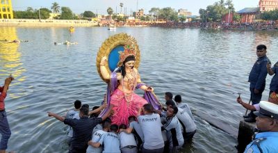 नेपालगन्ज । नवरात्रको घटस्थापनादेखि स्थापना गरिएको दुर्गा भवानीको मूर्ति (प्रतिमा) आज नदीमा सेलाइँदैछ । बाँके जिल्लाका शहर तथा ग्रामीण क्षेत्रमा स्थापना गरिएको दुर्गा मूर्तिलाई राप्ती नदी, मानखोला र कर्णालीमा लगेर सेलाउने गरिन्छ ।