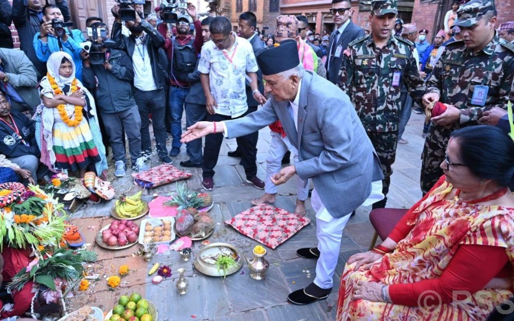 राष्ट्रपतिले नवदुर्गालाई ८४ व्यञ्जन अर्पण गर्दै विशेष पूजा गरे । साथै उनले नवदुर्गा नाचसमेत अवलोकन गरेका छन् । राष्ट्रपति पौडेललाई रमेश कर्माचार्यले नवदुर्गाको सङ्कल्प पूजा गराएका थिए । त्यसैगरी नवदुर्गाका मूल नाइके कृष्णकुमार बनमाला, सहायक नाइकेहरू भैलबहादुर बनमाला र इन्द्रबहादुर बनमालाले नवदुर्गाको प्रसाद प्रदान गरेका थिए । राष्ट्रपति पौडेलले नवदुर्गा देवगणको दर्शन पनि गरे ।