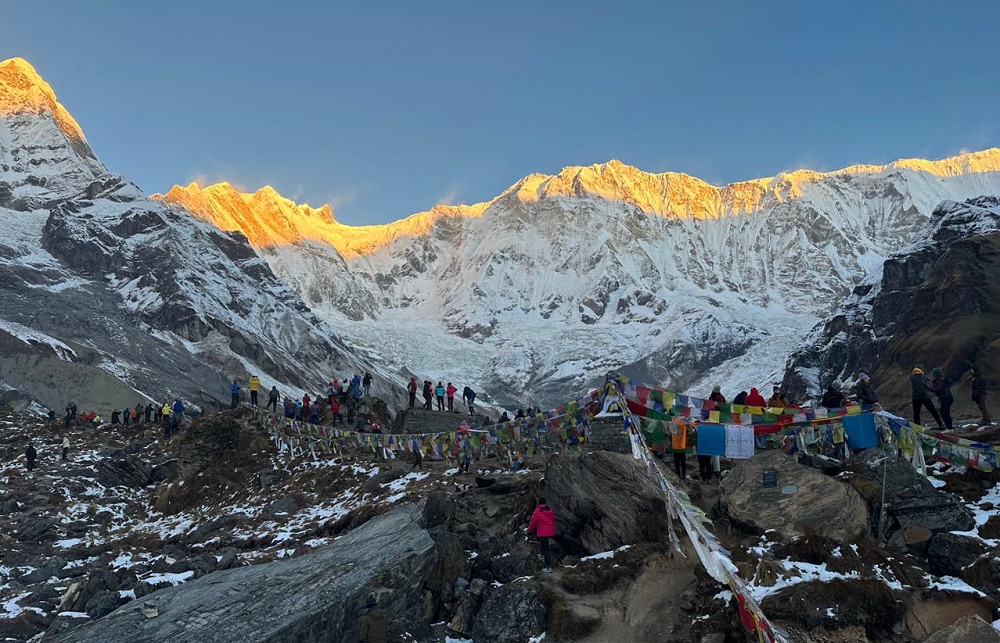 Gandaki: The Annapurna Base Camp is welcoming a significant number of domestic tourists during the Dashain holidays. Hotels here are presently fully occupied with internal tourists.