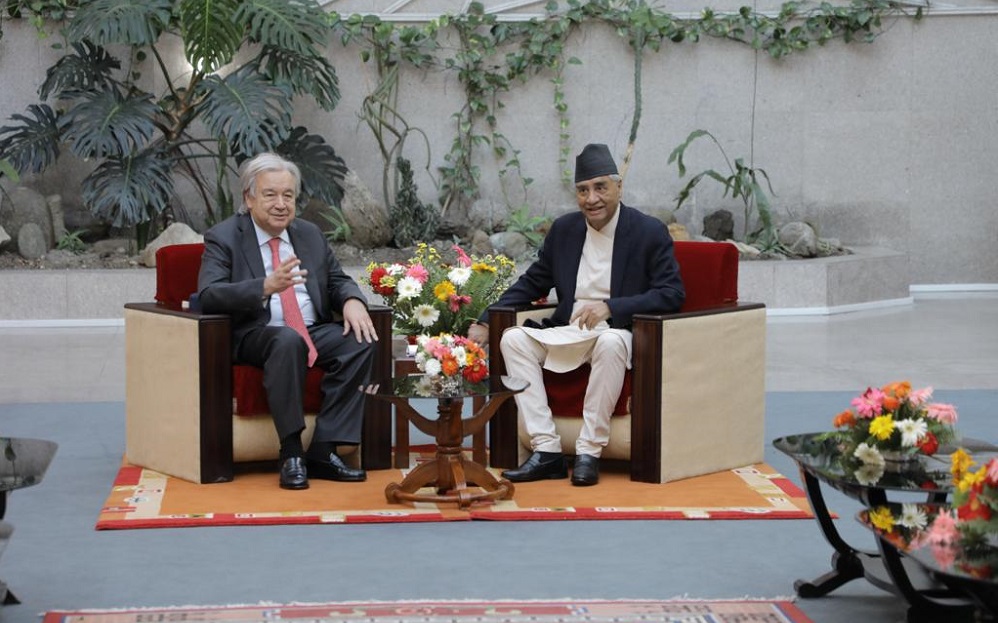 काठमाडौं । नेपालको औपचारिक भ्रमणमा रहनुभएका संयुक्त राष्ट्रसङ्घका महासचिव एन्टोनियो गुटेरेस र नेपाली कांग्रेसका सभापति एवं पूर्वप्रधानमन्त्री शेरबहादुर देउवाबीच भेटवार्ता भएको छ ।