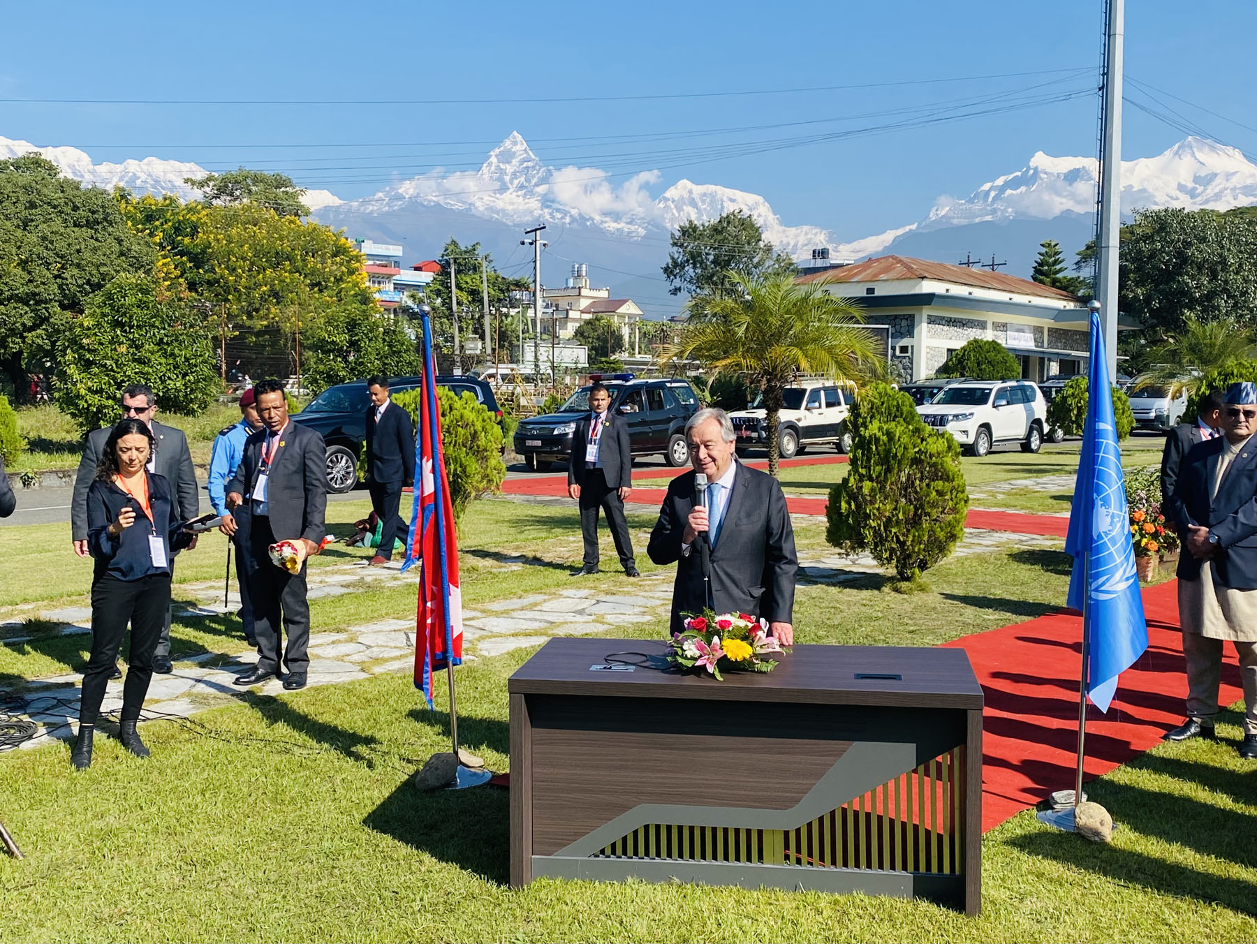 नेपाली सेनाको हेलिकोप्टरबाट अन्नपूर्ण आधार शिविर पुग्नुभएका महासचिव गुटेरेसलाई अन्नपूर्ण गाउँपालिकाका प्रमुख विष्णुबहादुर केसी, छोम्रोङ पर्यटन समितिका पदाधिकारी तथा स्थानीय पर्यटन व्यवसायीले स्वागत गरेका थिए ।