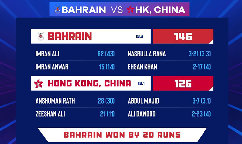 हङकङका लागि नस्रुला रानाले तीन विकेट लिए भने एहसान खान, अजिज खान र यासिम मुर्तजाले समान दुई-दुई विकेट लिए । जितसँगै बहराइनले दुई अङ्क जोडेको छ । हिजो भएको पहिलो खेलमा बहराइन युएईसँग पाँच विकेटले पराजित भएको थियो ।