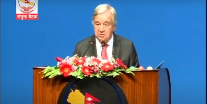 सङ्घीय संसदको दुवै सदनको संयुक्त बैठकमा आज सम्बोधन गदै महासचिव गुटेरेसले शान्ति मिसनका क्रममा मारिएका नेपाली सुरक्षाकर्मीको सम्मानमा एक मिनेट मौनधारण गर्न प्रस्ताव गर्दा बैठकमा सबै सदस्यहरु आफ्नो स्थानबाट उठेर मौनधारण गरेका थिए ।
