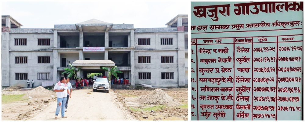 बाँकेको खजुरा गाँउपालिकामा मात्र ६ वर्षको स्थानीयतहको अवधिमा ८ जना प्रमुख प्रशासकिय अधिकृतहरु फेरिएका छन् । सरुवा भएर आएका मध्य २ जना बाहेक कसैले १ वर्ष पुरा गरेका छैनन् । खजुरा गाँउपालिकामा बमबहादुर केसी र मनिराम खराल बाहेक सबै प्रशासकिय अधिकृतहरु १ वर्ष भन्दा कम पालिकामा बसेका छन् ।