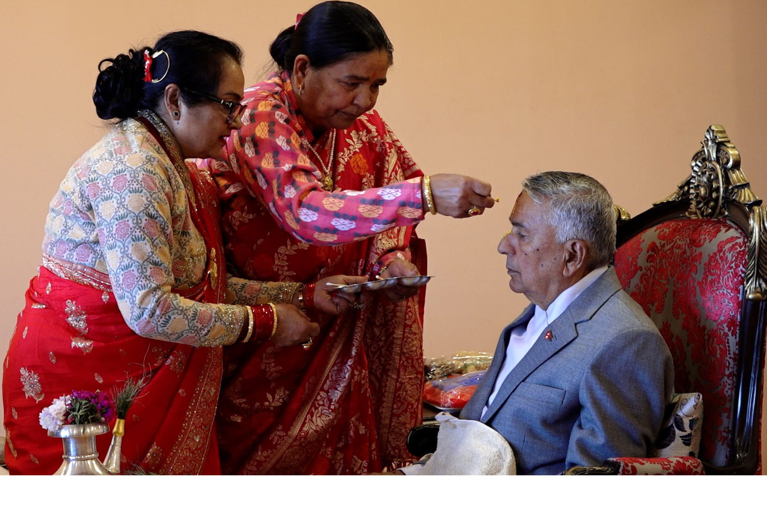 काठमाडौं । राष्ट्रपति रामचन्द्र पौडेलले बहिनीहरू शारदा पण्डित र चन्दा ओझाको हातबाट तिहारको टीका ग्रहण गरेका छन । राष्ट्रपति निवास शीलतनिवासमा आज बिहान १० बजेर ५१ मिनेटको शुभसाइतमा उनले बहिनीहरूबाट टीका ग्रहण गरेको राष्ट्रपतिको स्वकीय सचिवालयले जनाएको छ ।
