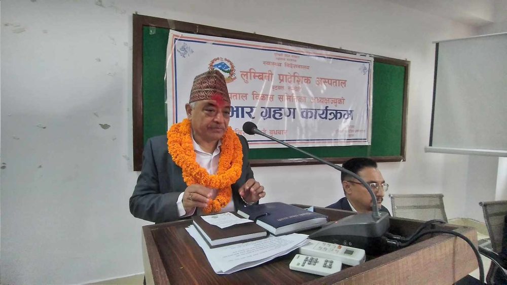 बुटवल । लुम्बिनी प्रादेशिक अस्पताल बिकास समितिका नवनियुक्त अध्यक्ष जीवनप्रसाद वझाले बुधबार पदभारण ग्रहण गरेका छन् । पदभार ग्रहण गर्दै अध्यक्ष वझाले लुम्बिनी प्रादेशिक अस्पताल बुटवलका जनताको भविष्यसँगै जोडिएकाले सोही अनुसार अघि बढ्ने प्रतिवद्धता ब्यक्त गरे ।
