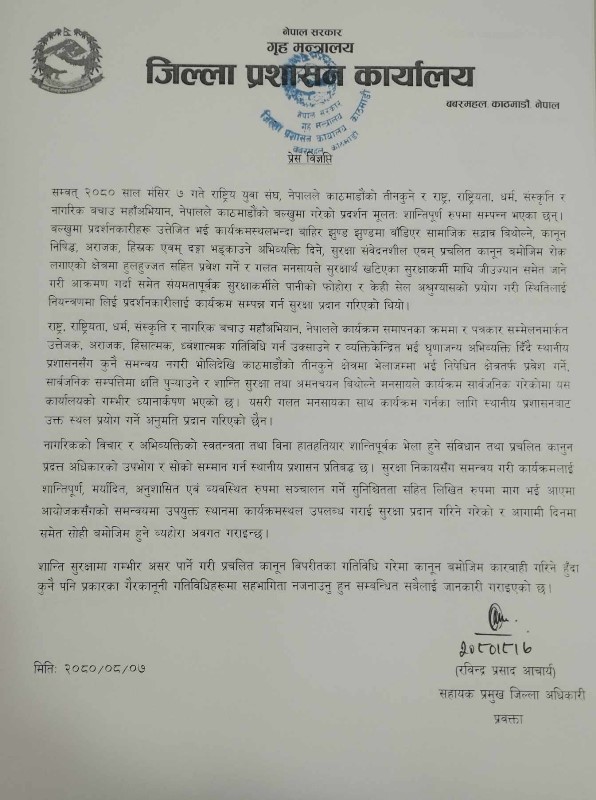 विज्ञप्तिमा भनिएको छ, ‘स्थानीय प्रशासनसँग कुनै समन्वय नगरी भोलिदेखि काठमाडौंको तीनकुने क्षेत्रमा भेलाजम्मा भई निषेधित क्षेत्रतर्फ प्रवेश गर्ने, सार्वजनिक सम्पत्तिमा क्षति पुयाउने र शान्ति सुरक्षा तथा अमनचयन विथोल्ने मनसायले कार्यक्रम सार्वजनिक गरेकोमा यस कार्यालयको गम्भीर ध्यानार्कषण भएको छ ।’