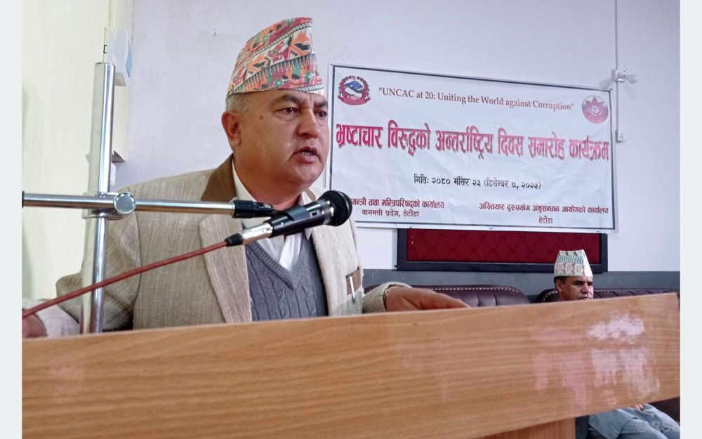 भ्रष्टाचार विरुद्धको अन्तर्राष्ट्रिय दिवसको अवसरमा आज मुख्यमन्त्री कार्यलय हेटौँडामा आयोजित कार्यक्रममा मुख्यमन्त्री जम्कट्टेलले अख्तियार दुरुपयोग अनुसन्धान आयोगको भूमिका निष्पक्ष हुनुपर्नेमा जोड दिए ।