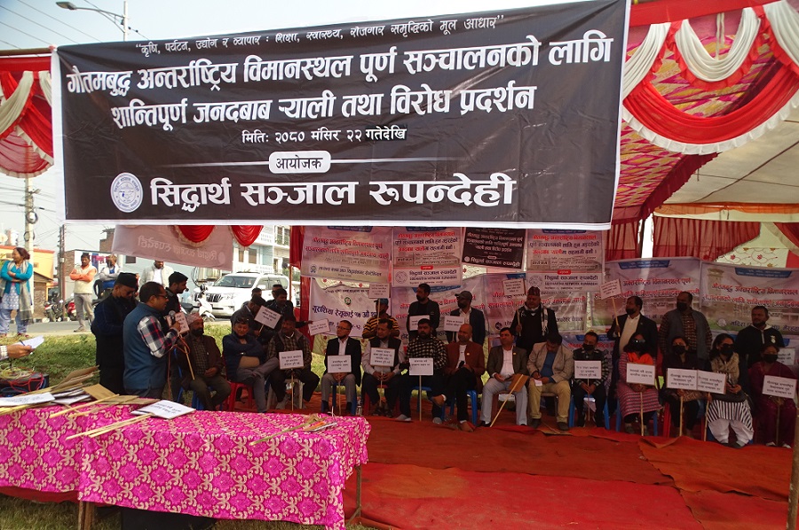 भैरहवा। रुपन्देहीका संघ संस्था तथा व्यवसायीहरुले गौतमबुद्ध विमानस्थल अगाडि अनिश्चितकालिन धर्ना बसेका छन्। लामो समयदेखि अन्तर्राष्ट्रिय उडान स्थगित भएको विमानस्थल पूर्ण क्षमतामा संचालनको माग गर्दै आइतबारबाट सिद्धार्थ सञ्जाल रुपन्देहीको नेतृत्वमा विरोधको कार्यक्रम सुरु भएको हो । चरणबद्ध आन्दोलन गरिरहेको सञ्जालले नियमित अन्तर्राष्ट्रिय उडान गर्न पटक–पटक सरकारलाई दवाव दिँदै आएपनि सुनुवाई नभएकोले बाध्य भएर धर्नाको कार्यक्रम अघि सारेको सञ्जालका अध्यक्ष अनिल कुमार ज्ञवालीले बताए ।