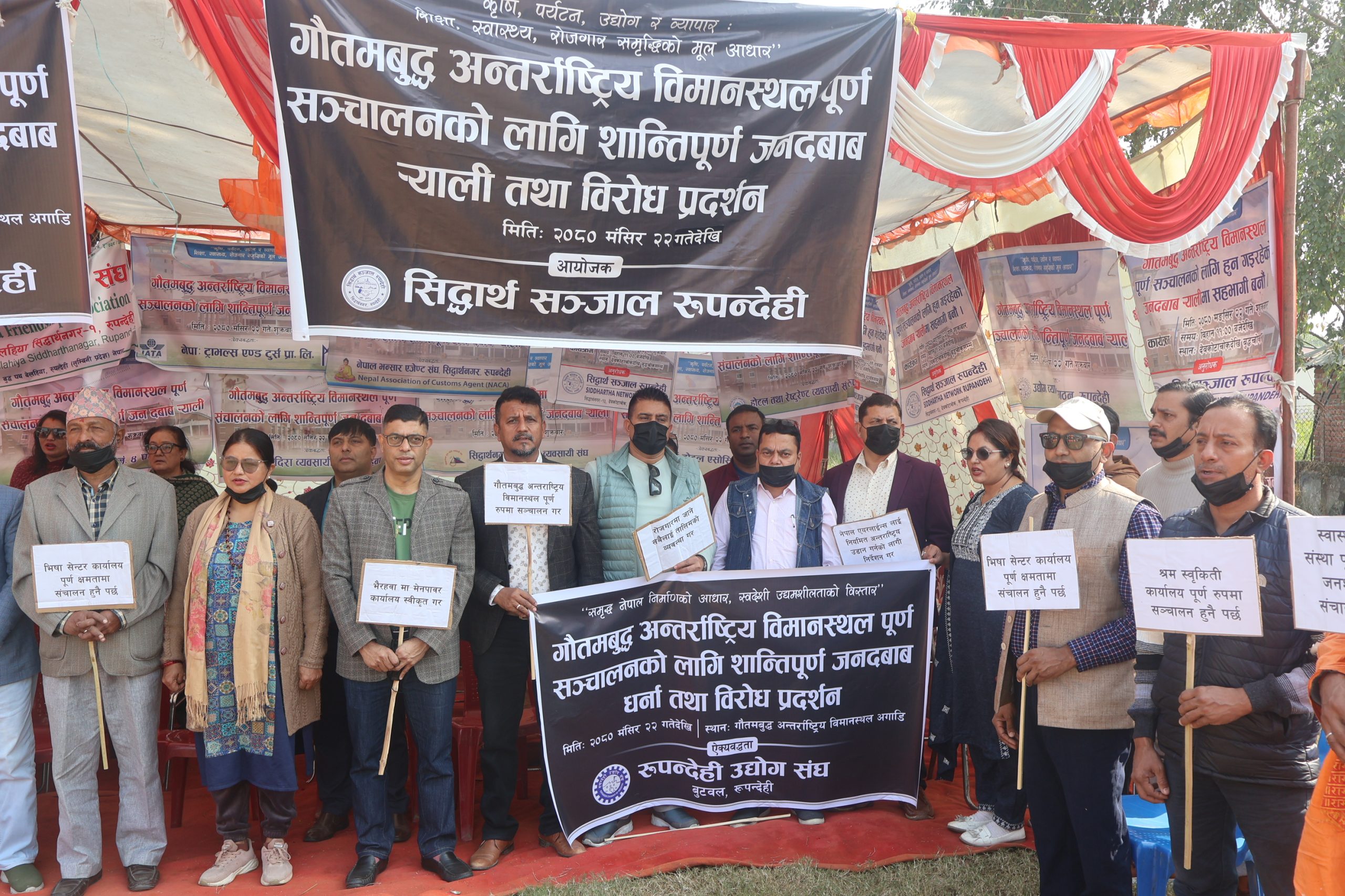 विमानस्थलबाट अन्तर्राष्ट्रिय उडान नियमित हुनुपर्ने माग राख्दै माग राख्दै सिद्धार्थ सञ्जाल, रुपन्देहीको नेतृत्वमा भैरहवामा दबाबमूलक कार्यक्रम गर्दै आइरहेको छ । जसअन्तर्गत आइतबारदेखि विमानस्थल प्रवेशद्वार अगाडि धर्ना सुरु भएको छ ।