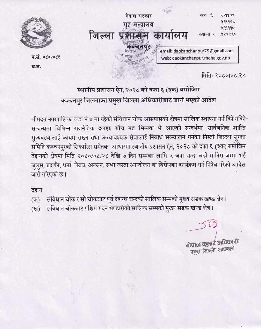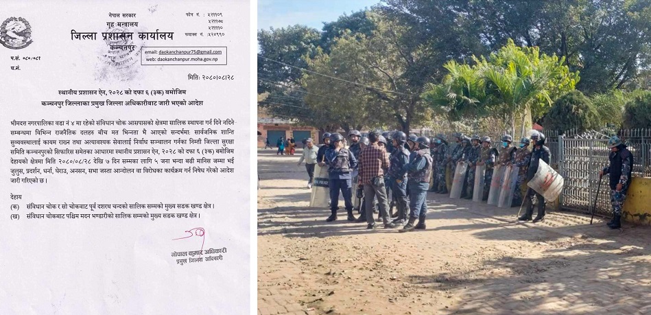 भीमदत्त नगरपालिका–४ को संविधान चोकदेखि पूर्वमा दशरथचन्दको शालिकसम्मको मुख्य सडक र पश्चिममा मदन भण्डारीको शालिकसम्मको मुख्य सडकखण्डमा निषेधाज्ञा जारी भएको छ ।