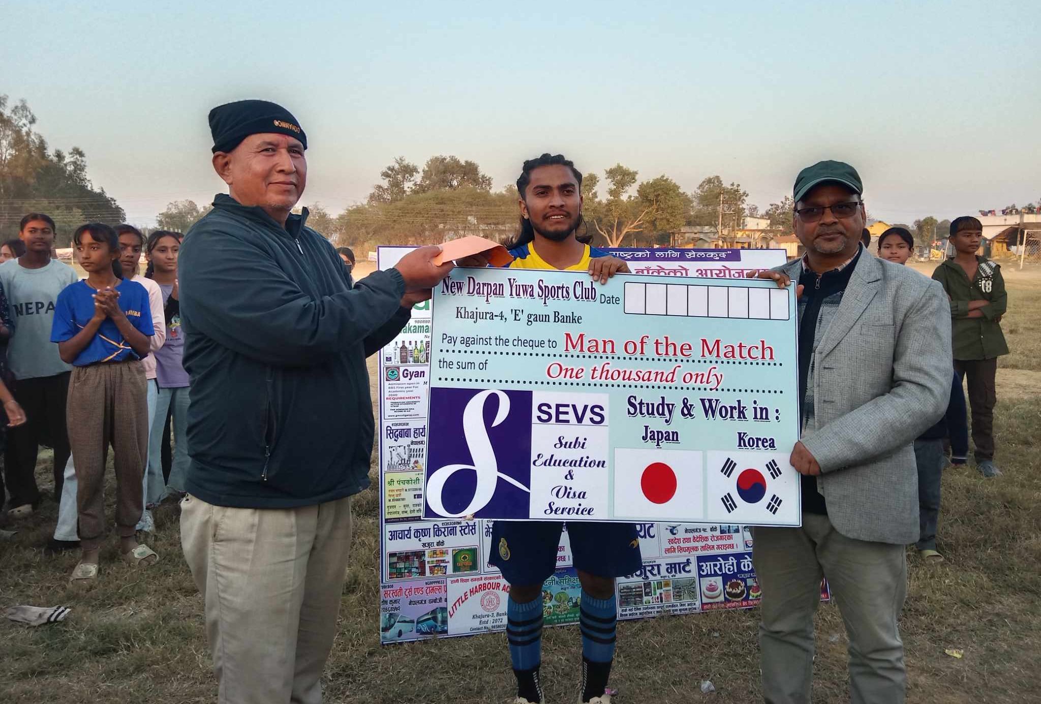 खजुरा । बाँकेको खजुरा ४ ई गाउँमा शनिबारदेखि जारी खुल्ला नकआउट फूटबल प्रतियोगिताको आइतबारको खेलमा आयोजक न्यू दर्पण युवा स्पोर्ट्स क्लव सि बिजयी भएको छ । न्यु दर्पणले युनाइटेड वारीयर नेपालगन्जलाई ० का विरुद्ध १ गोलको अन्तरले पराजित गर्दै बिजयी भएको हो । न्यू दर्पणका अविशेष सुनारले बिजयी गोल गरेका थिए । म्यान अफ म्याच सुनारलाई समाजसेवी शंकर रावत र युनाइटेड स्कुल नेपालगन्जका प्राचार्य सतानन्द उपाध्यायले नगद पुरस्कार दिए ।