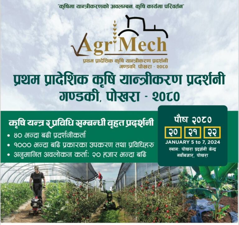 गण्डकी । पोखरामा आजदेखि प्रथम प्रदेशस्तरीय कृषि यान्त्रीकरण प्रदर्शनी सुरु हुने भएको छ । कृषि पूर्वाधार विकास तथा कृषि यान्त्रीकरण प्रवर्द्धन केन्द्र, गण्डकी प्रदेशको कृषि विकास निर्देशनालय, पोखरा महानगरपालिका र नेपाल कृषि मेसिनरी व्यवसायी सङ्घको संयुक्त आयोजना सञ्चालन हुने प्रदर्शनी आगामी आइतबारसम्म चल्नेछ ।