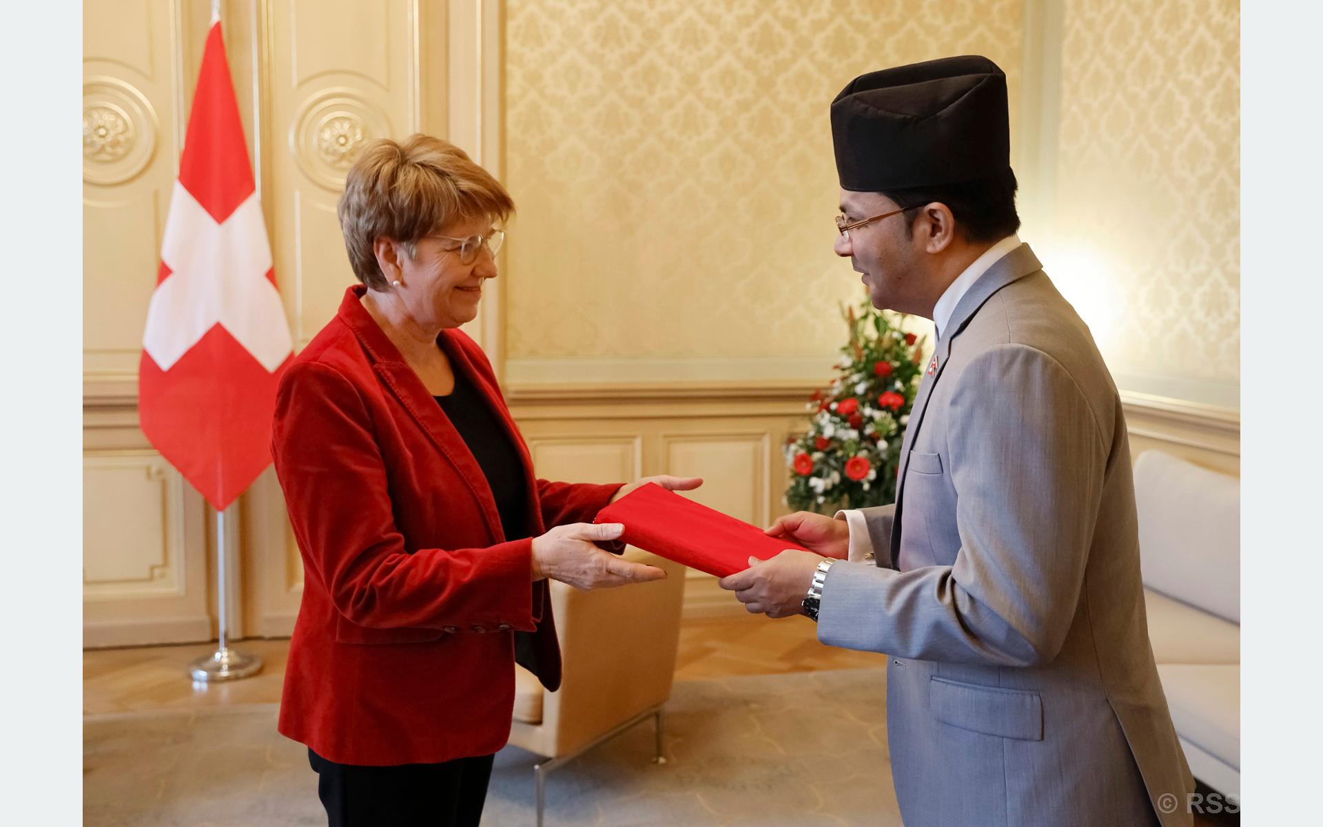 बर्नस्थित सङ्घीय राजाप्रसादमा आयोजित विशेष समारोहमा राजदूत सुवेदीले अध्यक्ष एमहेर्डसमक्ष मङ्गलबार आफ्नो ओहोदाको प्रमाणपत्र प्रस्तुत गरेका हुन् ।